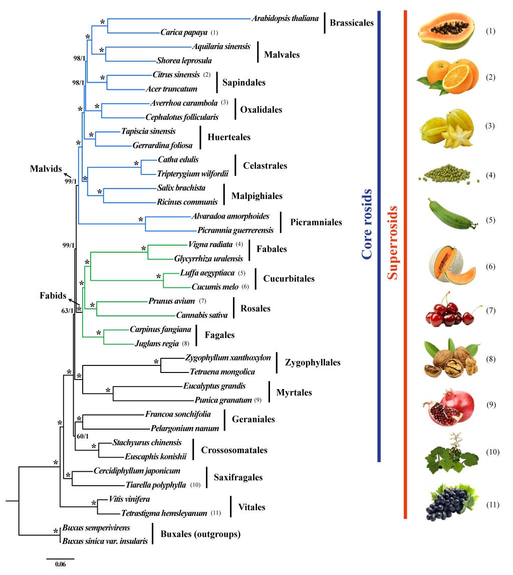 超蔷薇类约占所有被子植物的四分之一以上,包含虎耳草目、葡萄目和核心蔷薇类(16个目)。超蔷薇类植物具有显著的形态和生态多样性,包括许多重要的农作物、水果以及林木,具有重要的经济价值与观赏价值。尽管超蔷薇类长期以来一直是系统发育研究的焦点,但一些植物类群的系统位置目前仍存在争议,主要集中在:1)超蔷薇类的基部类群问题;2)COM支系是否为单系以及其归属问题;3)牻牛儿苗目、缨子木目、蒺藜目、桃金娘目和腺椒树目之间的系统发育关系。
