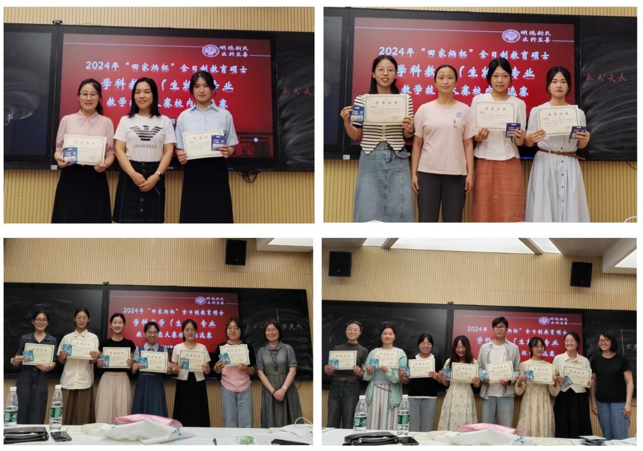 经过激烈角逐,刘佳欣和迟燕婷获得本次比赛的特等奖,贾思源、刘语欣、李彤欣获得一等奖,孙文幸、梅珂、尚珂、史永春、郭婧、任寒晓获得二等奖,高静、柴诗杰、王茹凡、索雨雨、杨柳青、张亚星、刘志慧获得三等奖。获得特等奖和一等奖的5位同学将代表学校参加2024年全国“田家炳杯”全日制教育硕士学科教学(生物)专业教学技能大赛。