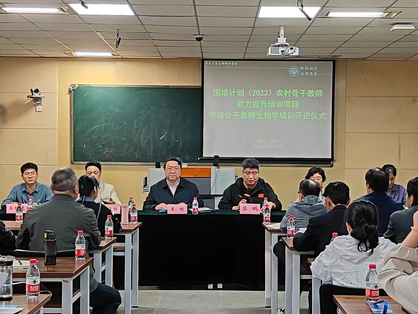 10月29日上午8点30分,bat365在线平台官网登录“国培计划(2023)—农村骨干教师能力提升初中生物市级骨干教师”培训班在生科院B101教室正式开班。bat365在线平台官网登录bat365在线平台官网登录执行院长、党委副书记王刚,副院长苏鹏,院办公室主任王松廷,院成教办主任李黎,生物科学系副主任肖保林,项目课程负责人张彤,班主任孙文幸、李佳欣等项目组成员和50名来自全省各地的初中生物教师学员参加了开班仪式,仪式由学院副院长苏鹏主持。