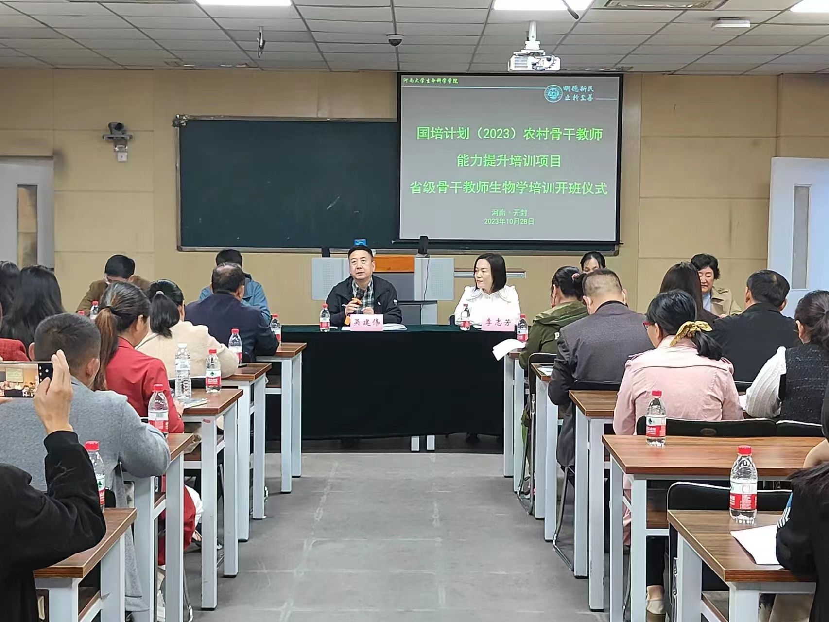 10.28日上午8点,bat365在线平台官网登录“国培计划(2023)—农村骨干教师能力提升初中生物省级骨干教师”培训班在生科院B101教室正式开班。bat365在线平台官网登录党委书记吴建伟,副院长李志芳,院办公室主任王松廷,院成教办主任李黎,生物科学系副主任肖保林,项目课程负责人张彤,班主任李佳欣、孙文幸等项目组成员和50名来自全省各地的初中生物教师学员参加了开班仪式,仪式由学院副院长李志芳主持。