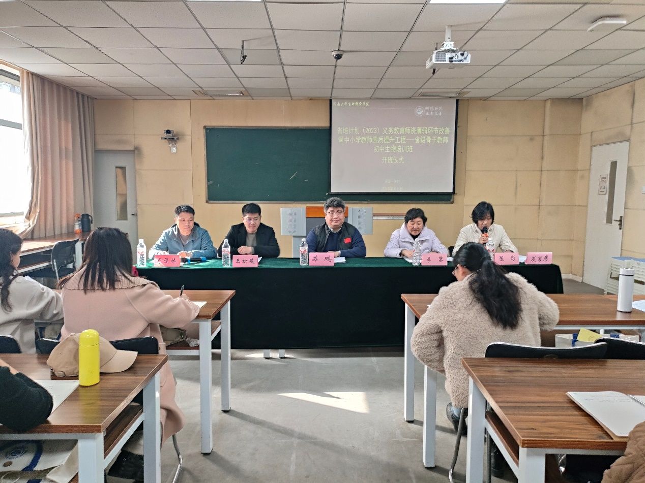 3月11日上午9点,bat365在线平台官网登录“省培计划(2023)—义务教育师资薄弱环节改善暨中小学教师素质提升工程—省级骨干教师(生物学)”培训班在bat365在线平台官网登录B101教室正式开班。bat365在线平台官网登录副院长苏鹏,行政办公室主任王松廷,成教办主任李黎,生物科学系副主任肖保林,项目课程负责人张彤等项目组成员和50名来自全省各地的中学生物教师学员参加了开班仪式,仪式由肖保林主持。