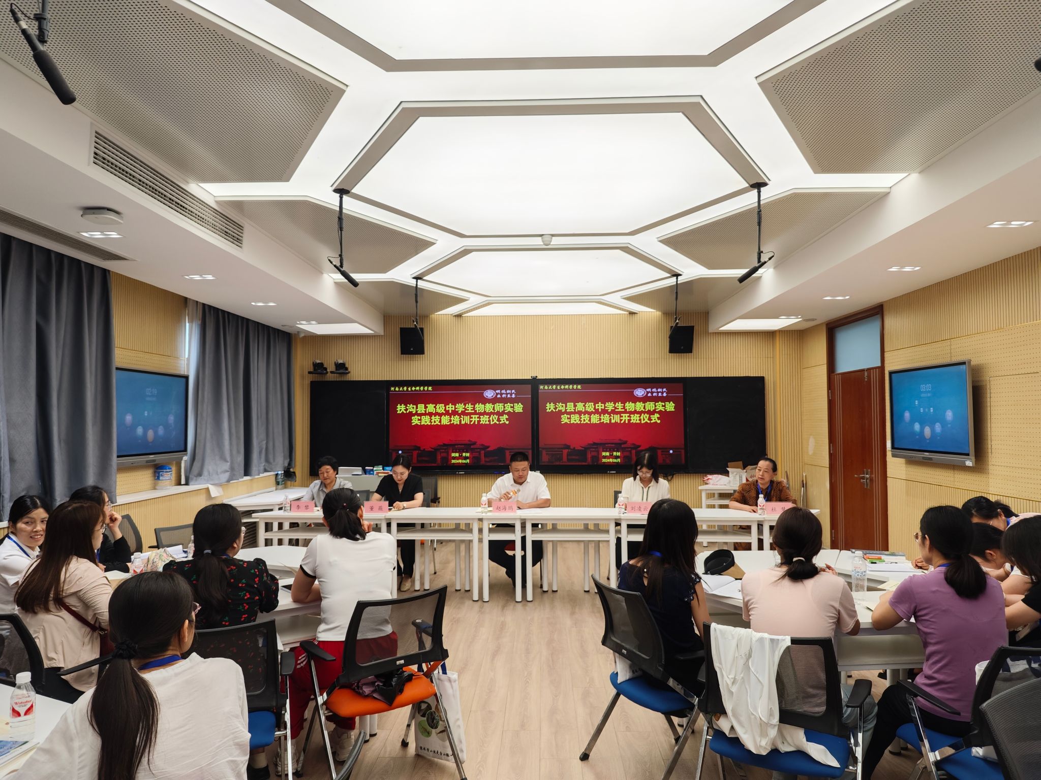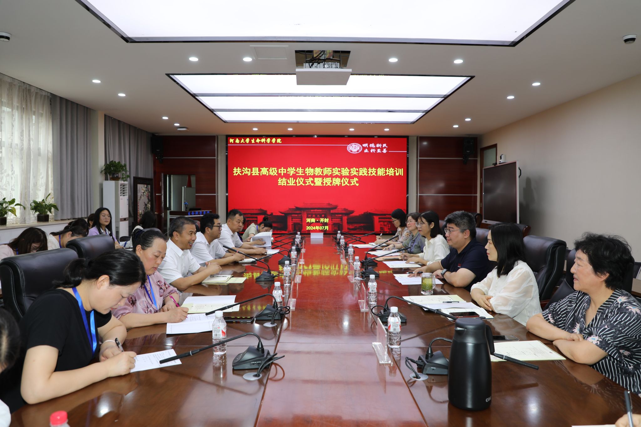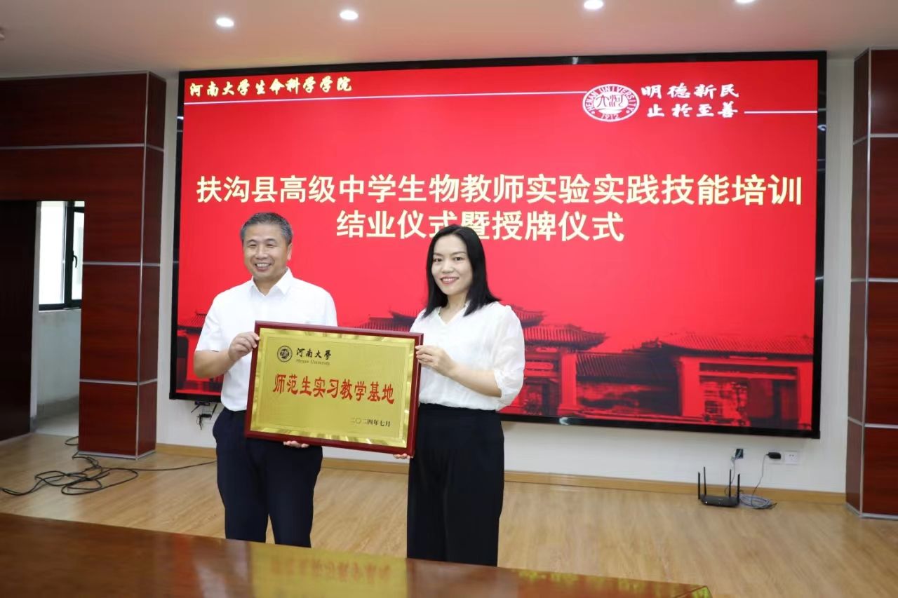 培训期间,双方教师围绕“中学师资培养和师范生教育”这一主题开展面对面交流活动,扶沟县高级中学教师纷纷表示授课教师认真负责,培训课程设置针对性强,专业性高,不仅提高了他们的实验操作技能,还拓宽了他们的教学思路。同时学院对扶沟县高级中学也提出了生物科学本科师范生学科教学(生物)教育硕士实习实践需求。结合双方优势,深化实质性合作,相互学习、共同发展,联合商议了本科师范生和教育硕士实习实践实施方案。会后,举行师范生实习实践教育基地建设协议签订及授牌仪式。
