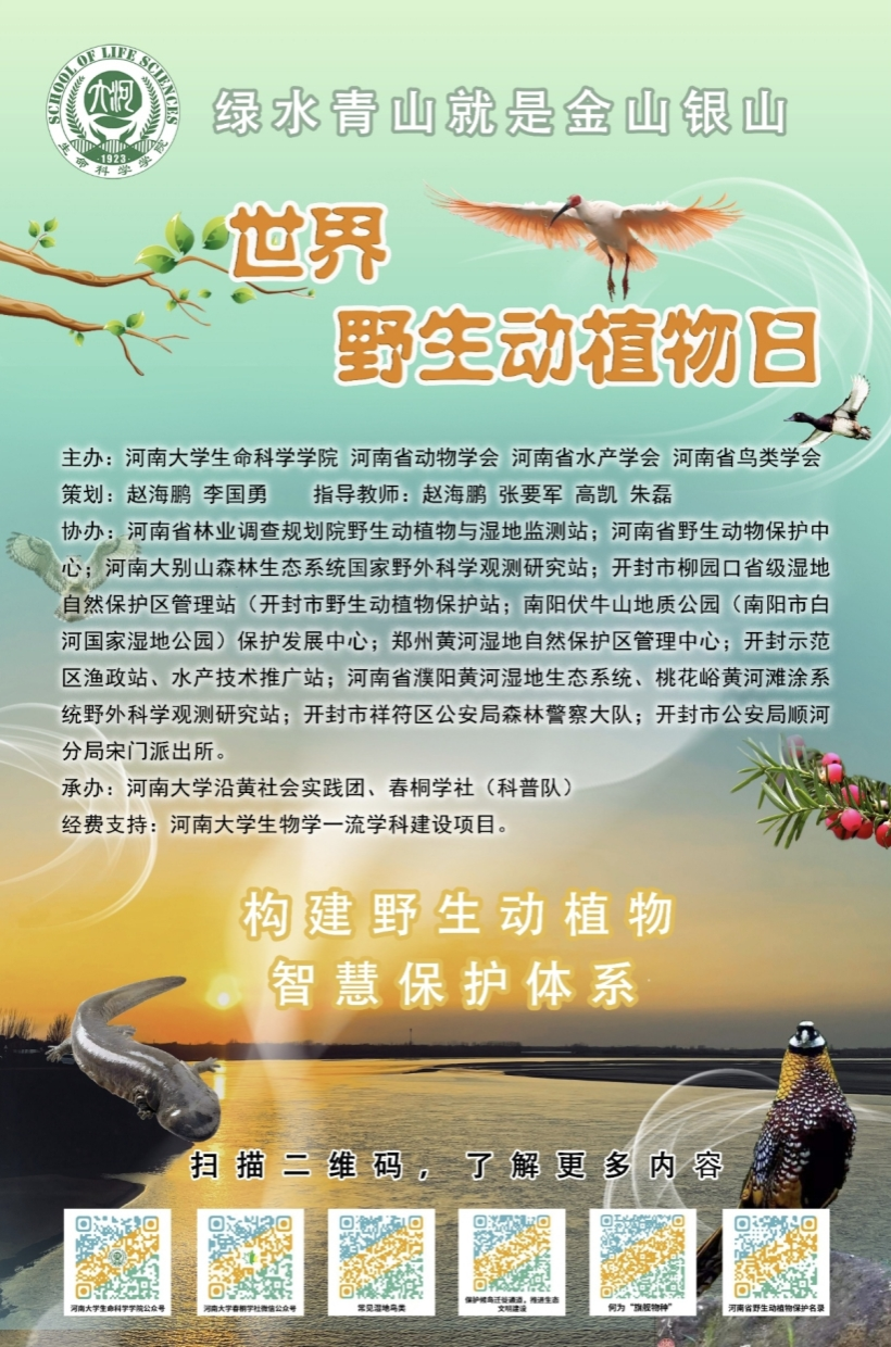 3月3日,第十一个“世界野生动植物日”之际,为进一步提高广大群众野生动植物保护意识,激发人们热爱大自然和保护野生动植物资源的热情。bat365在线平台官网登录联合河南省动物学会、河南省水产学会、河南省鸟类学会等多部门,在开封市晋安广场、校园内外等多个地方开展以“构建野生动植物智慧保护体系”为主题的世界野生动植物日科普活动。