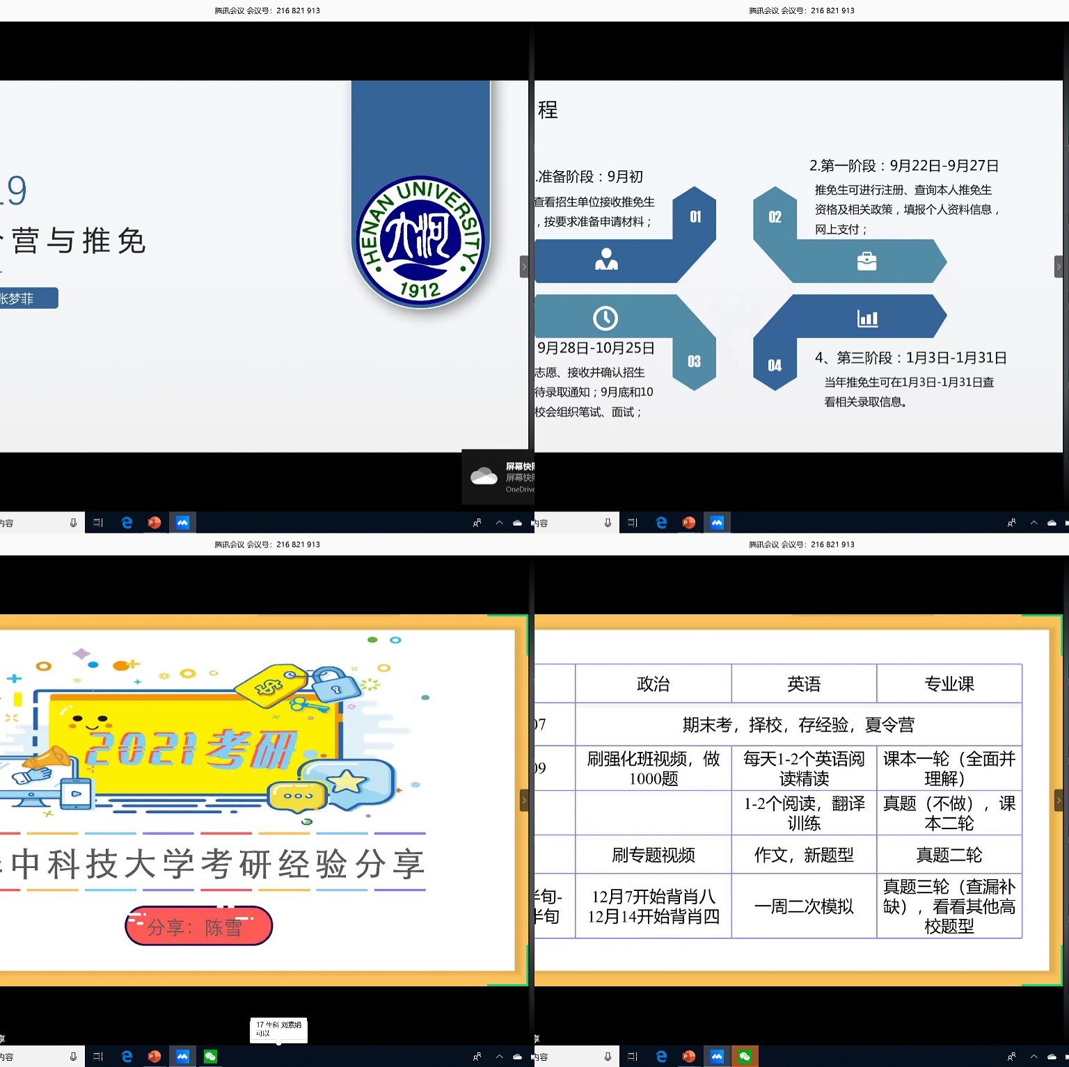 为了进一步提高bat365在线官网学生的考研热情、明确考研目标、掌握相关考研技巧、了解更多考研信息,6月5日中午,bat365在线官网开展了线上考研经验交流会。会议邀请了10位在保研和考研中脱颖而出的2016级本科生,为2017级本科生分享他们的考研经历与经验。