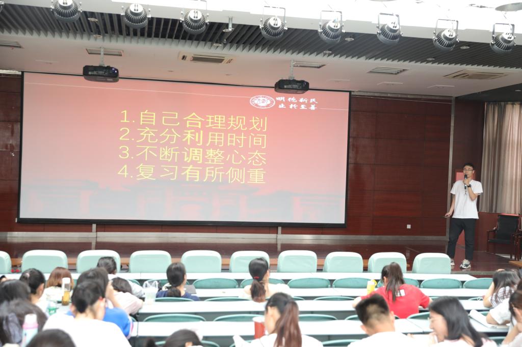 首先,年级长生物工程班的刘啸林同学向大家讲解了《bat365在线平台官网登录全日制普通本科学生管理规定》以及《bat365在线平台官网登录考试工作管理条例》,强调了作弊的危害,提醒同学们要好好复习,切勿抱侥幸心理。他向同学们分享了自己复习过程中的四点体会:合理的做规划、充分利用时间、不断调整心态、自己有所侧重。