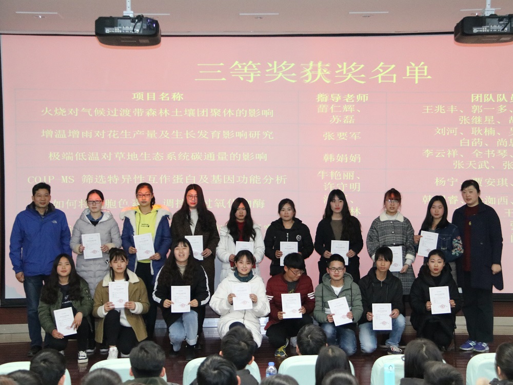 在获奖师生代表发言中,一等奖团队指导教师李保珠对学院给予参赛队伍的指导和帮助表示感谢,告诫参赛同学在备赛过的中要信心百倍、努力把实验做好,并预祝同学们在第二届大赛中取得更好成绩。获奖学生代表2015级生物科学专业学生武敏、王雅男与大家分享参赛心得,讲述备赛注意事项,鼓励同学们积极备赛。