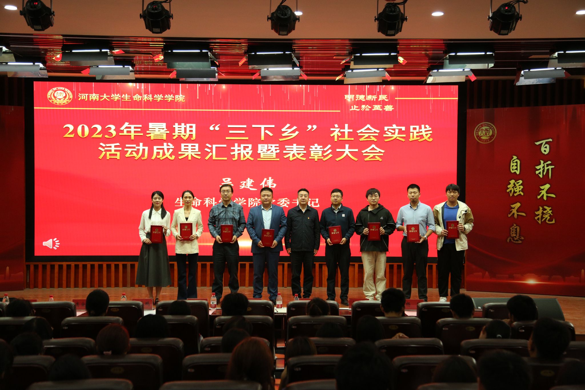 为进一步引导生科学子在社会实践中厚植爱国之情,砥砺强国之志,11月2日下午,bat365在线平台官网登录举行2023年度暑假“三下乡”社会实践活动成果汇报暨表彰大会。本次会议以“盛夏‘乡’约奋斗 秋日共话硕果”为主题,进一步深化社会实践育人实效,通过成果汇报、典型发言、表彰先进强化经验总结、激励典型。学院党委书记吴建伟、副书记宋永鹏、副院长赵海鹏及受表彰的师生、学生代表参加会议。会议由学院团委书记张丽主持。