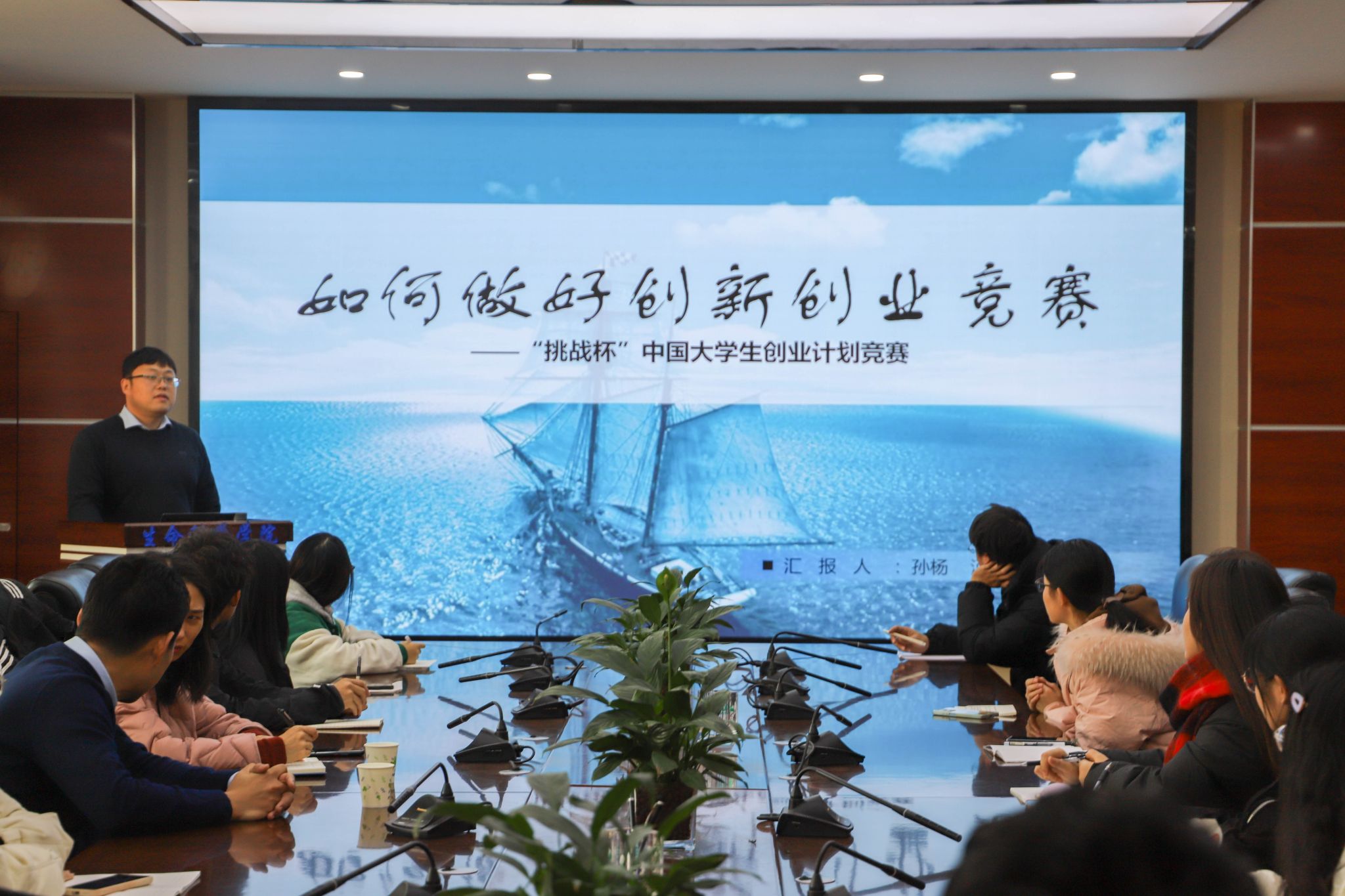 孙杨介绍了“大挑”、“小挑”区别以及参赛要求,使同学们更加深刻地认识“挑战杯”赛事。他结合自身经验从“以终为始”、“团队为先”、“好项目的生命周期”、“求真务实”四个方面详细地向同学们进行赛前指导,包括商业计划书的书写、PPT的制作、团队的分工、路演的练习等等,并结合获奖队伍实例,分析其成功的可取之处以及存在的不足,鼓励同学们以更严格的标准要求自己,向更高的目标努力,臻于至善。最后,孙杨老师向同学们分享自己的心得体会,一是备赛期间要明确项目方向;二是注重团队合作,共同认真打磨项目;三是答辩环节力求共鸣,为在场的同学们提供了宝贵的建议。