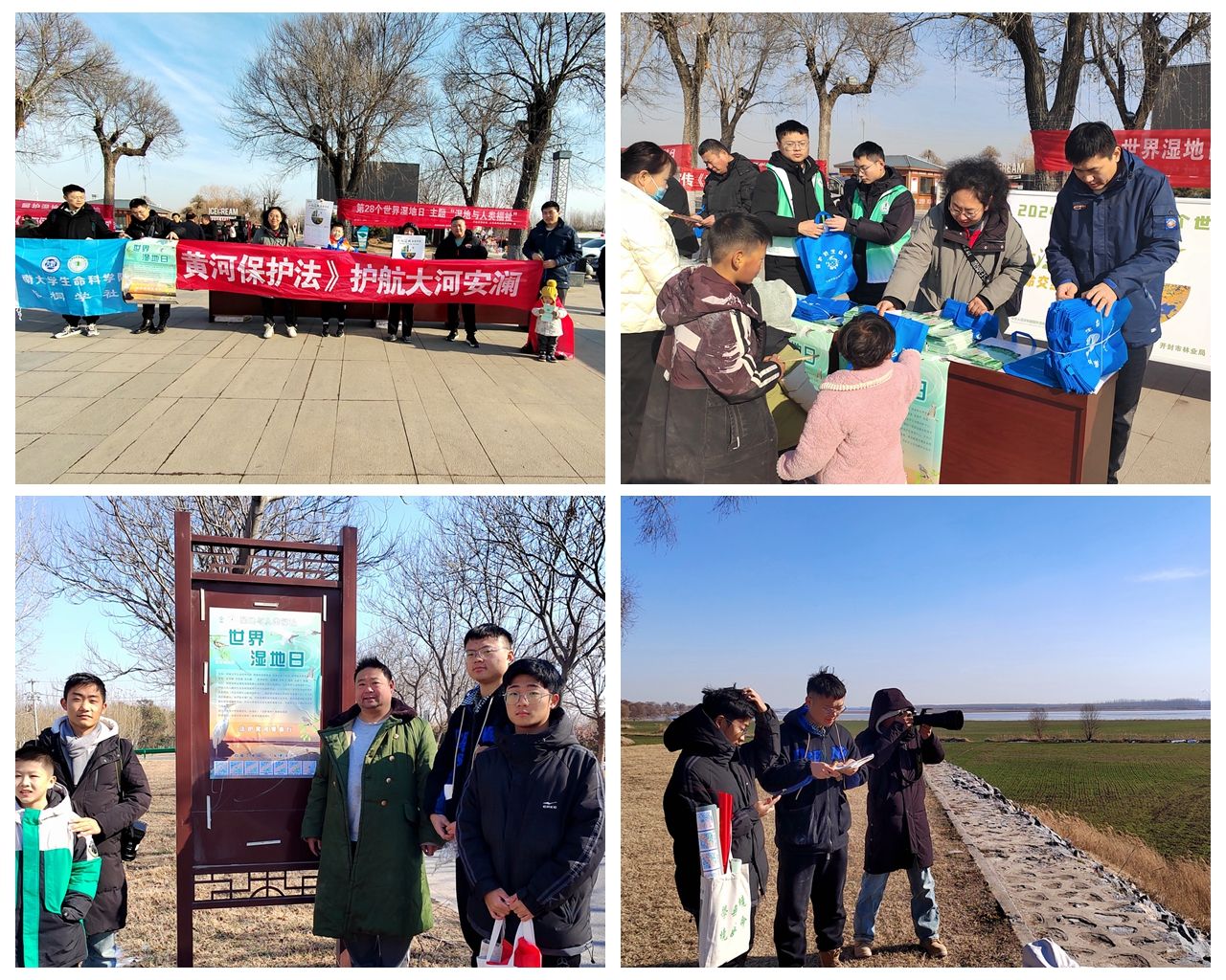为提升全民湿地保护意识,1月26日,学院副院长赵海鹏,青年教师田宝良、李文娆带领实践团成员赴开封市兰考金牛湖湿地公园,携手开封市林业局、开封市柳园口省级湿地自然保护区管理站和兰考县林业服务中心等开展2024年“世界湿地日”主题科普活动,宣传横幅、主题海报吸引了当地居民的关注。师生作为保护黄河的实践者、宣传员,张贴悬挂《黄河保护法》相关海报、条幅,发放《湿地保护法》《环境保护法》《开封柳园口省级湿地自然保护区鸟类图册》和《河南省百种鸟类》等宣传材料,为民众解读国家关于湿地保护与修复、湿地生物资源保护的相关政策。通过听取黄河河务局工作人员讲述黄河保护措施和抗灾救险的历程,大家领悟到保护黄河的艰辛和“团结、务实、拼搏、奉献”的黄河精神内涵。