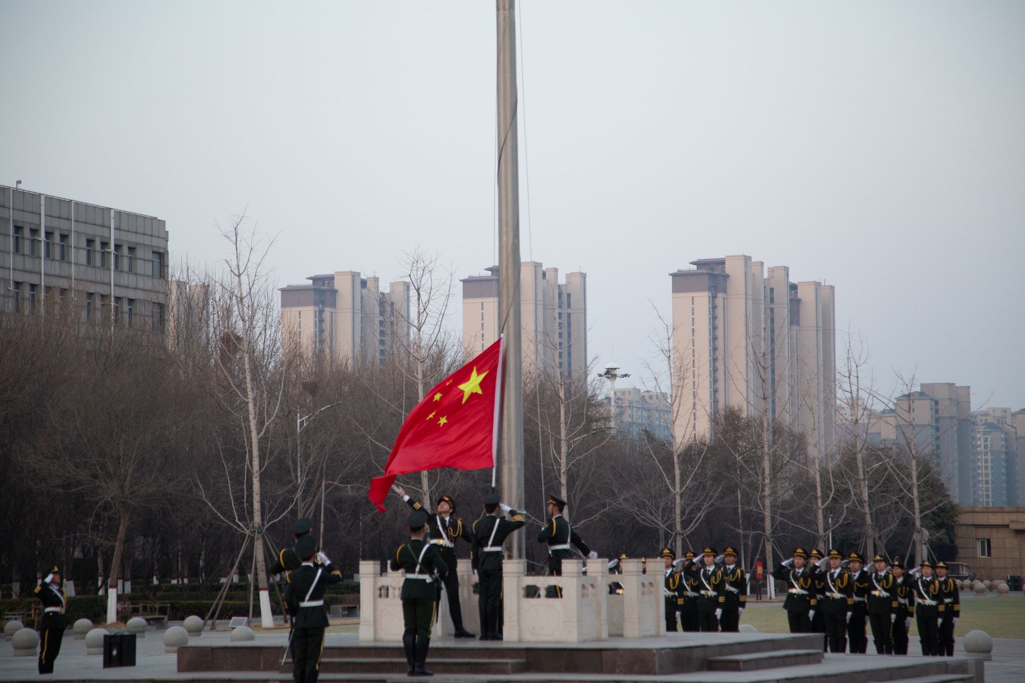 春风拂面,旭日东升,在充满希望的清晨里,学院师生齐聚五星红旗之下,6时30分,升旗仪式准时开始。国旗护卫队迎着朝阳,步伐铿锵有力,护卫着神圣的五星红旗,昂首阔步走向国旗台。伴着慷慨激昂的《义勇军进行曲》,全体师生庄严地向国旗行注目礼,五星红旗冉冉升起,在熠熠晨光中迎风飘扬,师生们的爱国情怀油然而生。