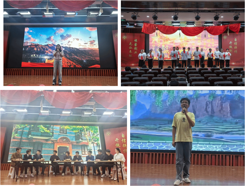 活动伊始,青马班学员代表进行主题教育成果汇报。此次汇报在豫剧《朝阳沟》选段中拉开帷幕,表演者用激昂高亢的唱腔和精湛的技艺表达了知识青年积极响应国家号召,投身乡村建设的热情和决心,用中华戏曲文化让学院耳目一新;短剧《中共一大》以讲述与情景表演相结合的方式让同学们深入了解了中国共产党的诞生过程和早期发展,体现了对中国共产党的深深敬畏和无限热爱之情;独唱《有我》和朗诵《红船》将活动现场的氛围推向了高潮,表演者极具感染力的歌声和充满激情的诵读使同学们回忆起革命先烈们那段峥嵘的光辉岁月,深深地感动了在场的每位同学,本次主题教育成果汇报在合唱《少年中国说》中落下帷幕。