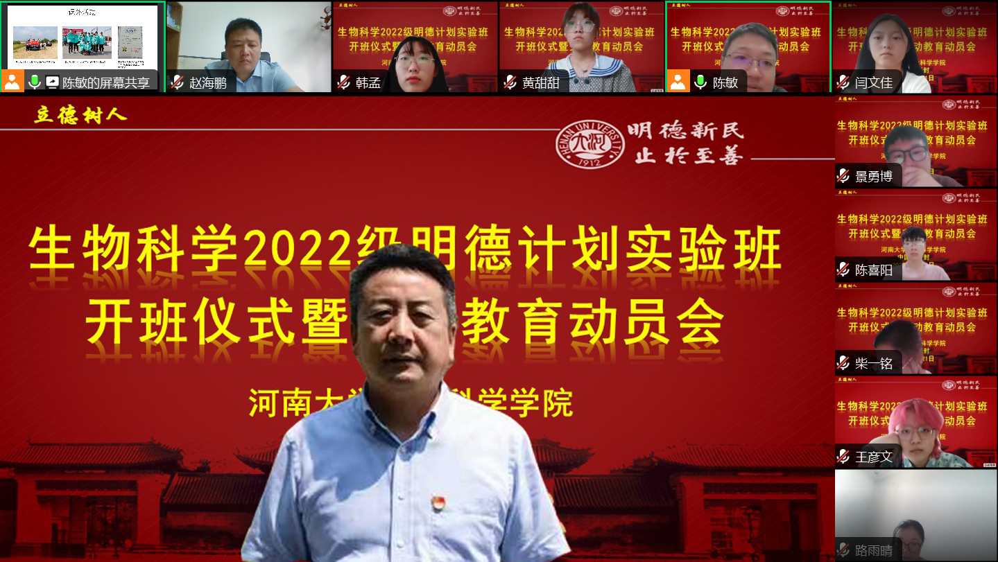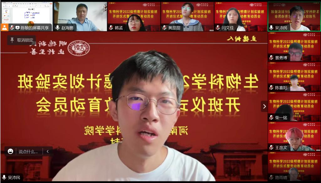 7月21日上午,2022级生物科学明德计划实验班开班仪式暨劳动教育动员会顺利举行。学院领导、相关教师和明德班的同学在线上齐聚一堂,共同迎接新的学习征程。学院党委书记、明德计划管理委员会主任吴建伟,党委副书记宋永鹏,副院长赵海鹏、李志芳,生物科学系主任刘凌云、明德班班主任陈敏、辅导员李靖宇、劳动教育教师宋敏和本级明德计划25名本科生一起参加会议;会议由赵海鹏主持。