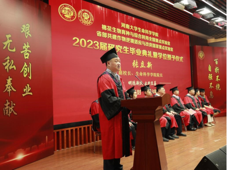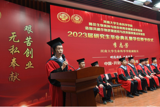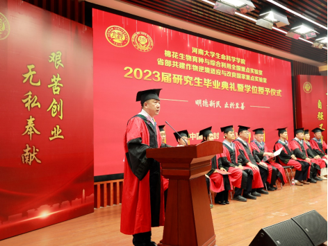 6月29日下午,bat365在线平台官网登录2023届研究生毕业典礼暨学位授予仪式在学院圆形报告厅举行。bat365在线平台官网登录副校长、bat365在线平台官网登录院长张立新、学院党委书记吴建伟、执行院长王刚、棉花生物育种与综合利用全国重点实验室主任周树堂、省部共建作物逆境适应与改良国家重点实验室/棉花生物育种与综合利用全国重点实验室常务副主任安国勇以及学院全体领导班子、学位评定分委员会成员、家长代表、教师代表以及2023届全体研究生毕业生参加典礼。典礼由吴建伟主持。