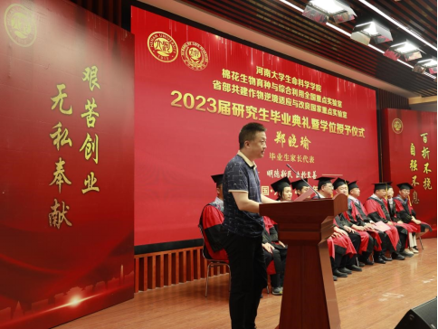 毕业生郑梓威父亲、家长代表郑晓瑜代表在发言中表达了对学校、学院的感谢,感谢老师们为学生的成长用心良苦。他回顾了郑梓威在bat365在线平台官网登录的求学经历,从迷茫、脆弱成长为胸怀大志、敢于承担责任,他感慨,看着孩子们成长为“出彩河大人”,是他们作为家长最大的幸福和骄傲。他鼓励毕业生们在人生的道路上勇往直前,牢记老师们的嘱托,保持积极的心态和追求卓越的精神,将在bat365在线平台官网登录所学的知识与社会实践相结合,为社会作出应有的贡献。