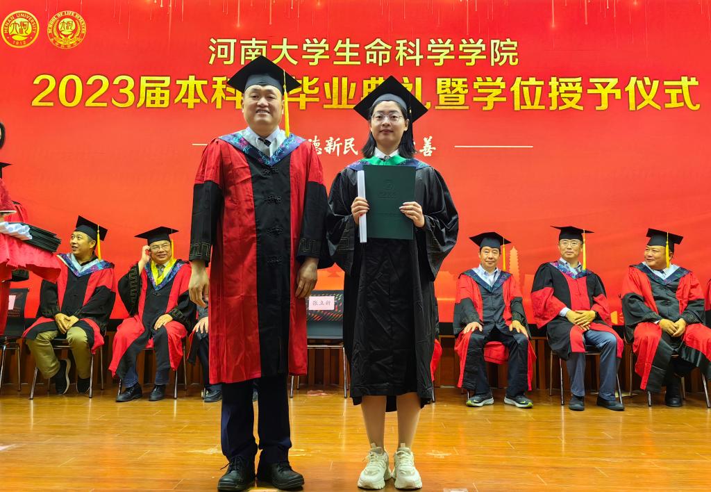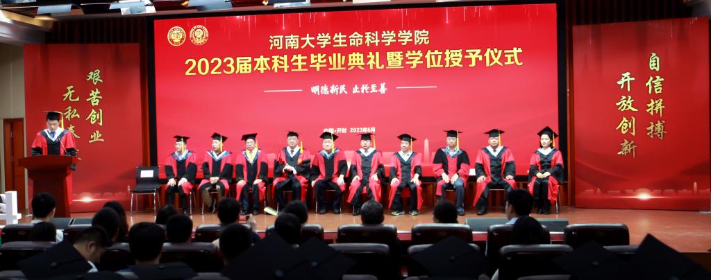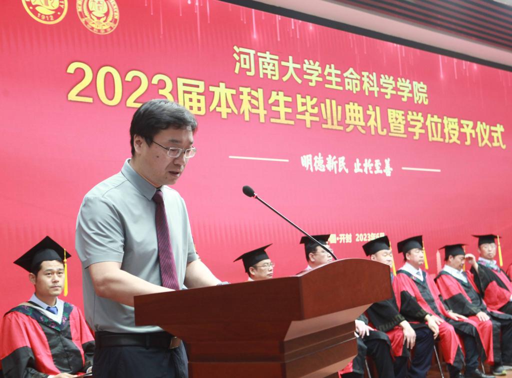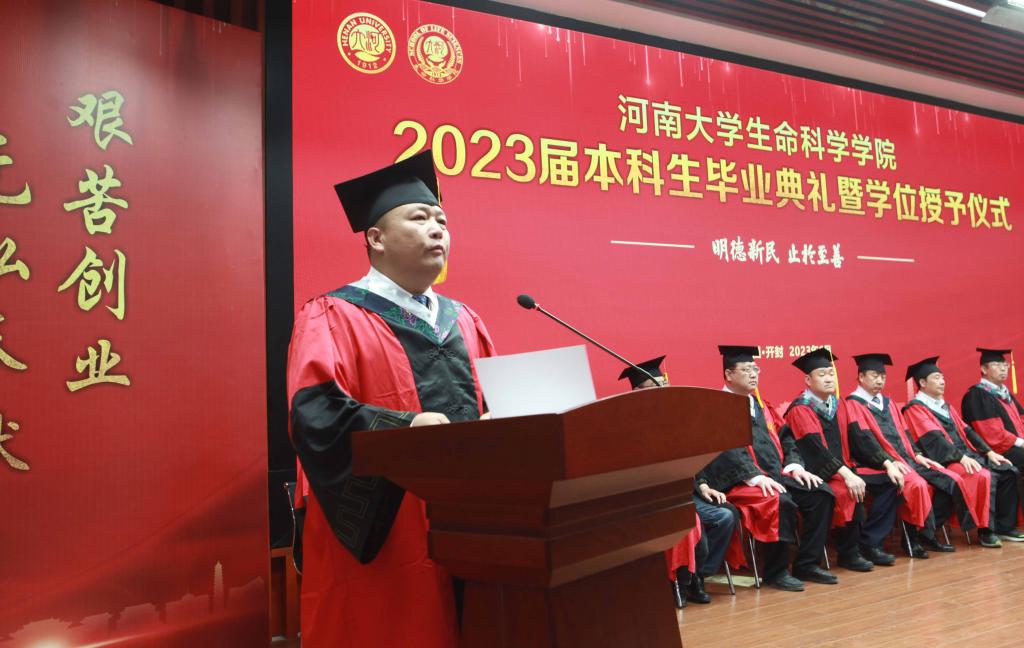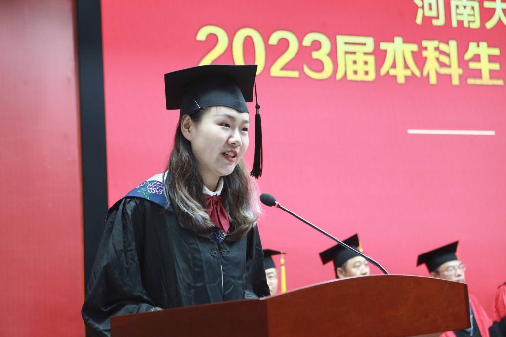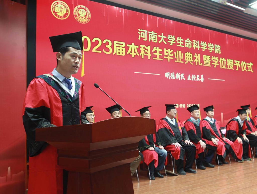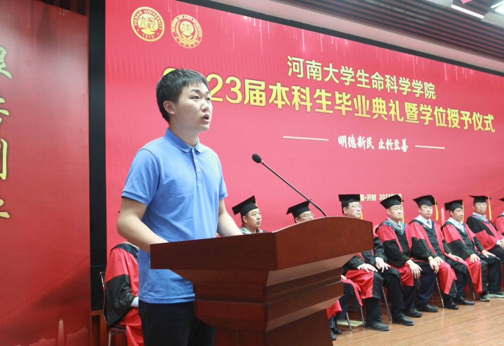 毕业生代表、2019级生物科学专业的余可儿代表全体毕业生向学校、学院表达了美好祝愿,感谢老师们的精心培养、谆谆教导,回忆大学四年的收获和成长,激励同学们恪守“明德新民,止于至善”的河大校训,“学无止境,境如生命”的生科品格,传承“无私奉献、艰苦创业”和“脚踏实地,仰望星空”的生科精神,在今后的人生路途中勇攀高峰。在校生代表、2021级生物科学专业学生李骋宇为毕业生送上了最美好的祝福和真诚的感谢。他表示,全体在校生将以学长学姐们为榜样,认真刻苦、积极奋发、坚定初心、一往无前,传承“铁塔牌”学子坚韧不拔的精神,继承“卓越生科人”的优良品质,以自己优异的成绩,用自己的实际行动,为母校的发展和进步,为祖国的复兴和强盛贡献青春力量。