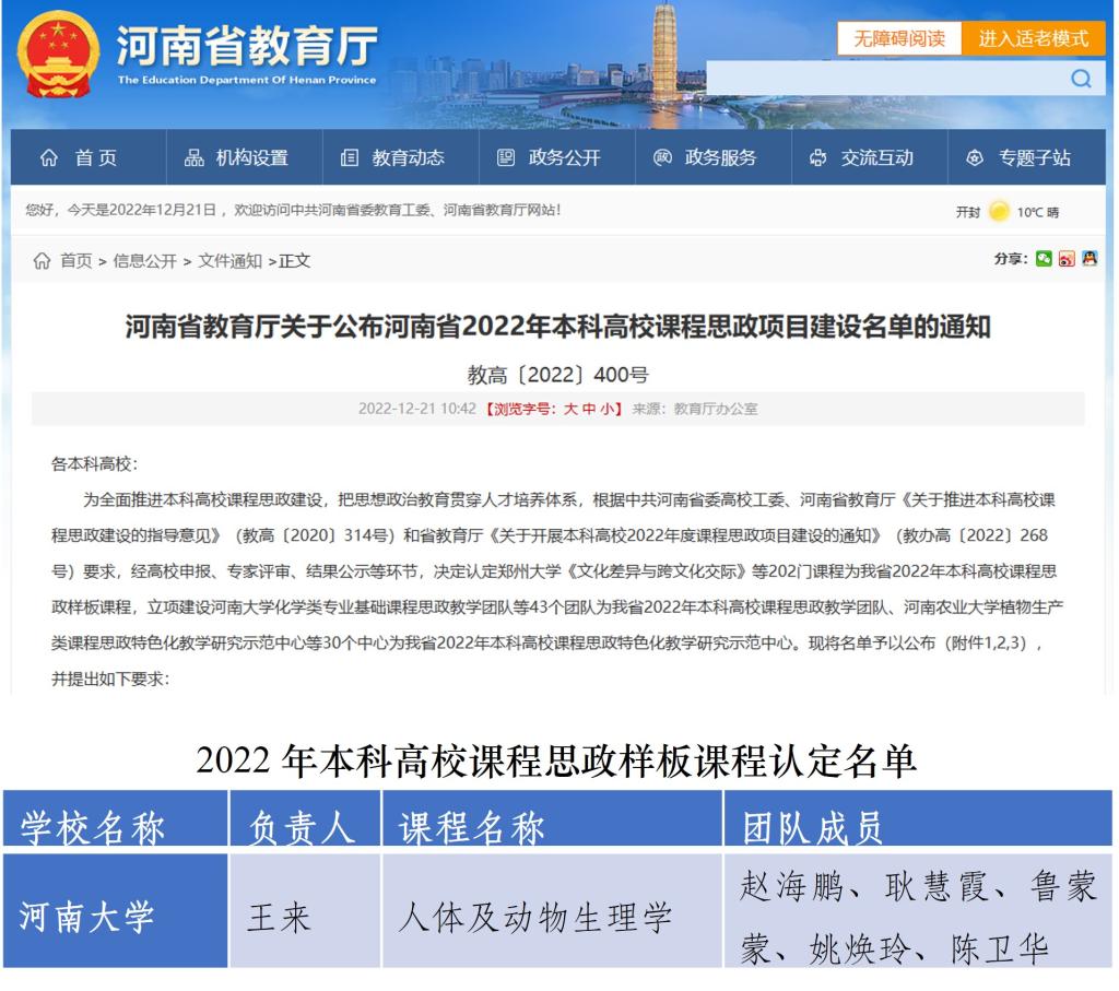 近日,河南省教育厅公布河南省2022年本科高校课程思政项目建设名单(教高〔2022〕400号),bat365在线平台官网登录王来副教授主持的《人体及动物生理学》被认定为河南省课程思政样板课程,bat365在线官网连续3年在省级课程思政样板课程建设取得佳绩。