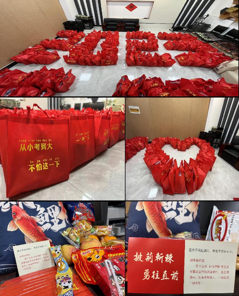 在2023届全国硕士研究生招生考试即将到来之际,bat365在线平台官网登录再次开展“浓情暖心、一研为定”助力考研活动,为同学们精心准备“考研大礼包”。定制有“从小考到大 不怕这一下” “一研为定”的考研大礼包被摆成一个大大的“2023”,给2023届考研学子传达最暖心最美好的祝愿!每份礼包内都装载着学院对学生们满满的美好祝福:苹果,“苹”安顺利;橙子,“橙”功上岸;棒棒糖,“棒”上有名;面包,“面面”俱到;暖宝宝,温 “暖”予你;上好佳薯片,“好”运“佳”成;旺仔牛奶,做上岸的仔;锦鲤抱枕,锦鲤附体;印有“逢考必过”口罩,以及双面祝福语“披荆斩棘 勇往直前”的贺卡共十样礼品,寓意十全十美,心想事成!