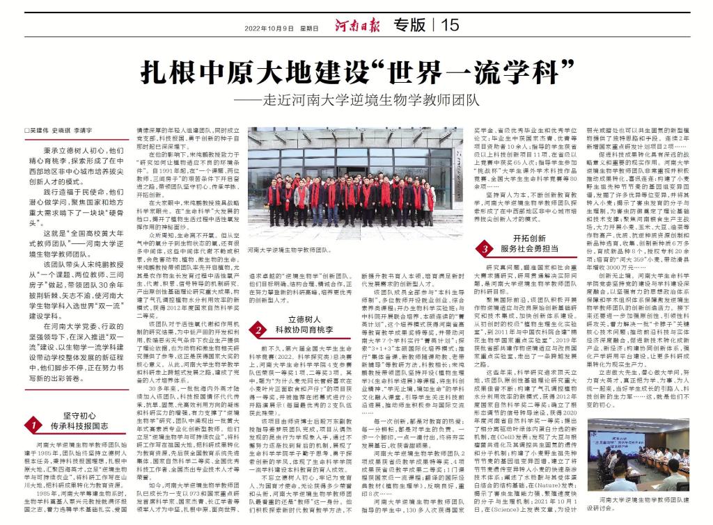 bat365在线平台官网登录逆境生物学教师团队始建于1985年,团队始终坚持立德树人根本任务,秉持科技报国理想,扎根中原大地,汇聚四海英才,立足“逆境生物学与可持续农业”,将科研工作写在山川大地,把科研成果转化为教育资源。