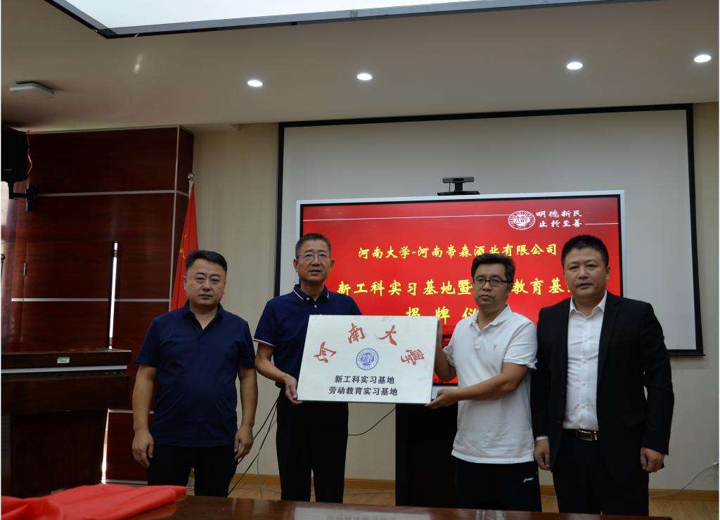 根据前期bat365在线平台官网登录与河南帝森酒业有限公司已达成的意向和签署的协议,王炜冲、赵志牛、朱显峰、赵海鹏共同为生物工程专业新工科实习基地、劳动教育基地实习基地揭牌。