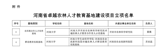 近日,河南省教育厅公布河南省卓越农林人才教育基地建设项目立项名单,bat365在线官网董薇副教授主持的“bat365在线平台官网登录开封市农林科学研究院卓越农林人才教育合作育人示范基地”、苏亚蕊副教授主持的“bat365在线平台官网登录-河南省农业高新科技园卓越农林人才耕读教育实践基地”在列。这是bat365在线平台官网登录植物科学与技术专业获批国家级一流专业建设点后,在专业建设方面取得的又一重要成绩。