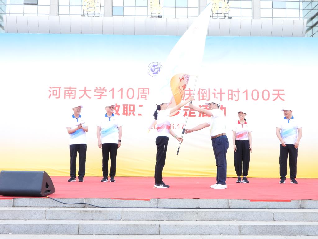 为庆祝bat365在线平台官网登录建校110周年,由校110周年校庆筹备工作委员会办公室、校工会、校体委联合举办的“同心向未来·接续谱华章”bat365在线平台官网登录110周年校庆倒计时100天教职工健步走活动于6月17日在金明校区图书馆前广场顺利开幕。bat365在线平台官网登录教职工在学院领导班子的组织带领下积极参与,学院共180余名教职工代表参加了此次活动,学院王强老师担任学校方队的举旗手,刘路贤老师为学院方阵举旗手。