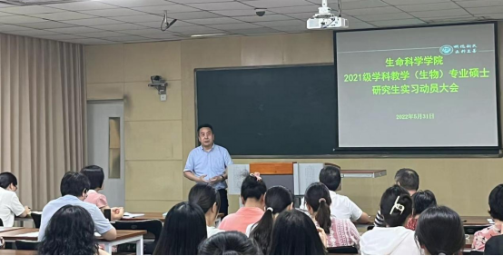 吴建伟表示,学院长期重视学科教学(生物)专业硕士的培养工作,坚持立德树人,实施以职业能力为导向的专业硕士研究生培养模式,十年来培养了大量优秀的一线中学教师。他们不仅是学生灵魂的锻造师,而且是生物学兴趣的启蒙师。他指出教育实习是教师培养不可或缺的重要环节,是理论联系实际最直接的途径。同学们要带着研究的视角走进教育实践,发现问题、解决问题,为高质量完成学位论文打下良好的基础。他鼓励大家要克服实习过程中的困难、虚心求教,充满教育之爱,生成实践智慧,提升教学技能。