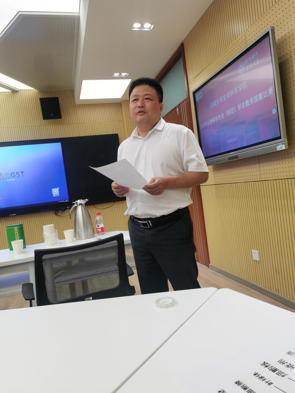 5月22日,生物科学(师范)专业学生教学技能现场赛在学院A305智慧教室举行。共22名生物科学专业2019级、2020级的师范生经过前期选拔入围比赛。bat365在线平台官网登录附属中学高级教师吴中、开封高级中学高级教师史静娟,学院学科竞赛表达应试类赛事指导教师张彤、肖保林和苏亚蕊等5人组成评委专家组,组长由张彤担任。副院长赵海鹏出席赛事并致开幕词