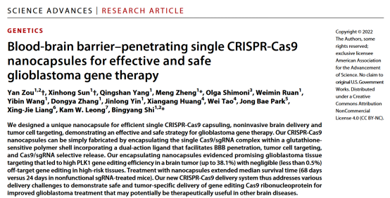 该成果以“Blood-brain barrier-penetrating single CRISPR-Cas9 nanocapsules for effective and safe glioblastoma gene therapy”发表,bat365在线平台官网登录为第一单位,邹艳副教授,硕士研究生孙新红为该论文共同第一作者,冰洋教授、郑蒙教授为共同通讯作者。该研究历时4年,得到了来自美国哥伦比亚大学Kam Leong院士、国家纳米中心梁兴杰教授、韩国国立癌症中心Jong Bea Park教授、哈佛医学院陶伟教授等合作者的大力支持和国家自然科学基金、国家重点研发纳米专项、河南省高校科技创新团队及人才支持计划等资助。