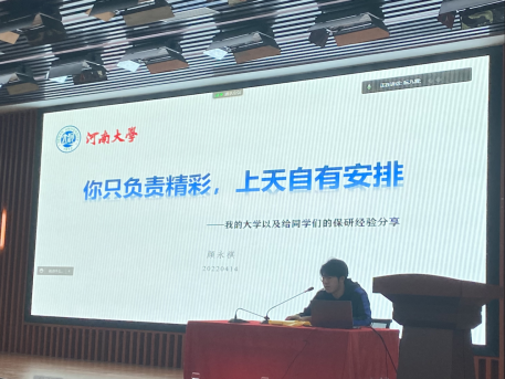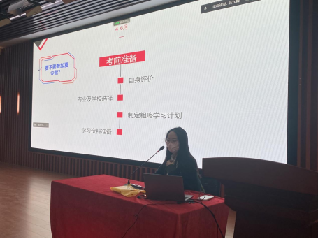 在考研经验交流环节,学院2018级考研成功的优秀毕业生李印、李晔、颜永祺、汪菡茜、王雪、张朋磊两位同学就保研、考研经验与方法为现场同学进行了详细的分享。