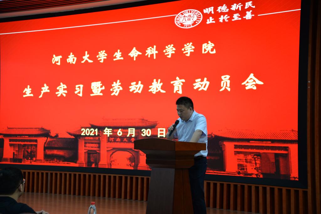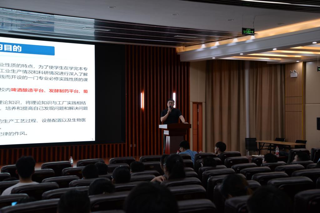 生产实习暨劳动教育动员会在学院圆形报告厅举行,赵海鹏、刘宇鹏、生物工程系生产实习指导组全体教师、辅导员李靖宇和2018级全体实习学生参加会议,会议由刘宇鹏主持。刘宇鹏介绍参会的成员和实习队伍组成。指导教师代表孙杨介绍了生物制药、啤酒酿造和葡萄酒酿造等三个校内实践平台所承担的实习任务,并强调了实习期间的工作纪律及注意事项。赵海鹏阐述了本次生产实习暨劳动教育目的、意义和重要性,并期望同学们的生产实习在充实的劳动中,规范的操作中有所收获,进一步树立“工科”思维,精益求精中塑造工匠精神。