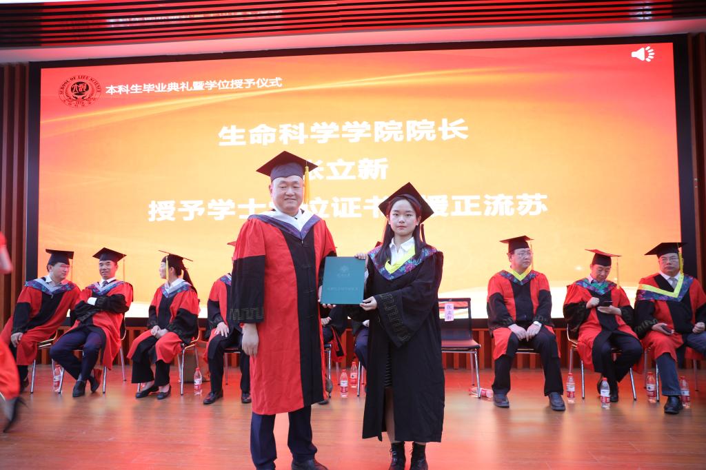 走过四载春秋,历经一千四百多个日夜,在河大的悠悠岁月,就这样倏忽而过。毕业生代表2017级生物工程专业刘啸林上台发言,他深情回顾了四年的大学时光,衷心地感谢老师们的悉心培育。青春的脚印留在校园的小路上,笑语欢歌留在花坛的馨香中,母校的每一个角落都珍藏着属于他们的记忆,难舍难分,未来成长的脚步不会停歇,他表示将会牢记校训和院训,继续积极进取,在实现自身价值的同时,报效祖国和社会。最后代表全体毕业生向学院表达美好的祝愿。
