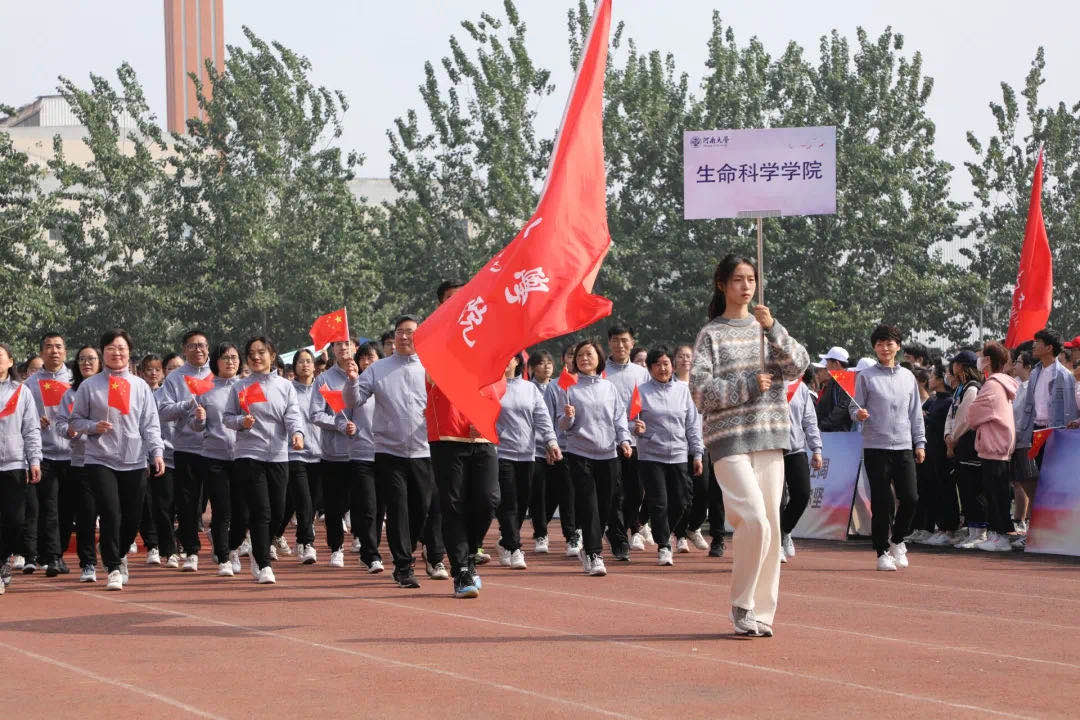 伴随着激昂慷慨的运动员进行曲,bat365在线平台官网登录代表队身着统一服装,挥舞着鲜红的五星红旗,昂首挺胸,迈着从容整齐的步伐走过主席台前接受检阅。精彩的啦啦操表演,展现了生科学子的青春活力;“红色曙光,蒸蒸日上;生命之光,点亮赛场”嘹亮的口号响彻全场,彰显了bat365在线官网师生蓬勃向上的精神风貌。