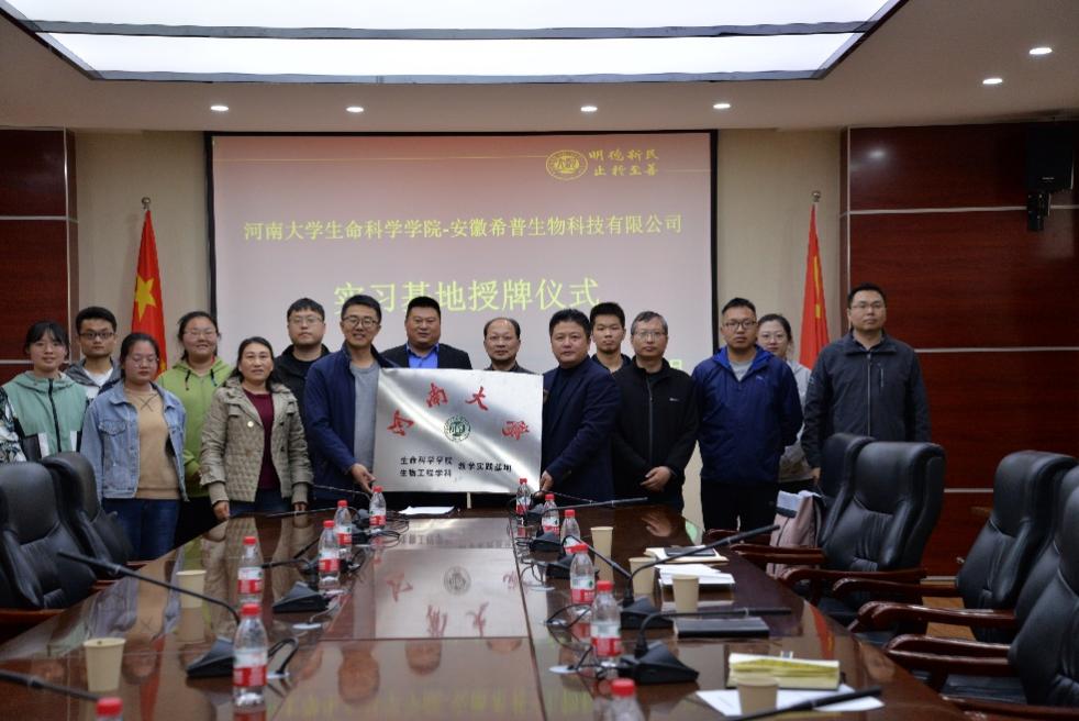 4月13日上午,bat365在线平台官网登录-安徽希普生物科技有限公司教学实践基地授牌仪式在bat365在线平台官网登录B201举行。bat365在线平台官网登录副院长赵海鹏、安徽希普生物科技有限公司总经理赵大伟、经理宋剑南、生物工程系各骨干教师、生物工程卓越工程师班学生等人员出席仪式。赵海鹏和赵大伟分别代表双方为教学实践基地签约并揭牌。仪式由生物工程系主任刘宇鹏主持。