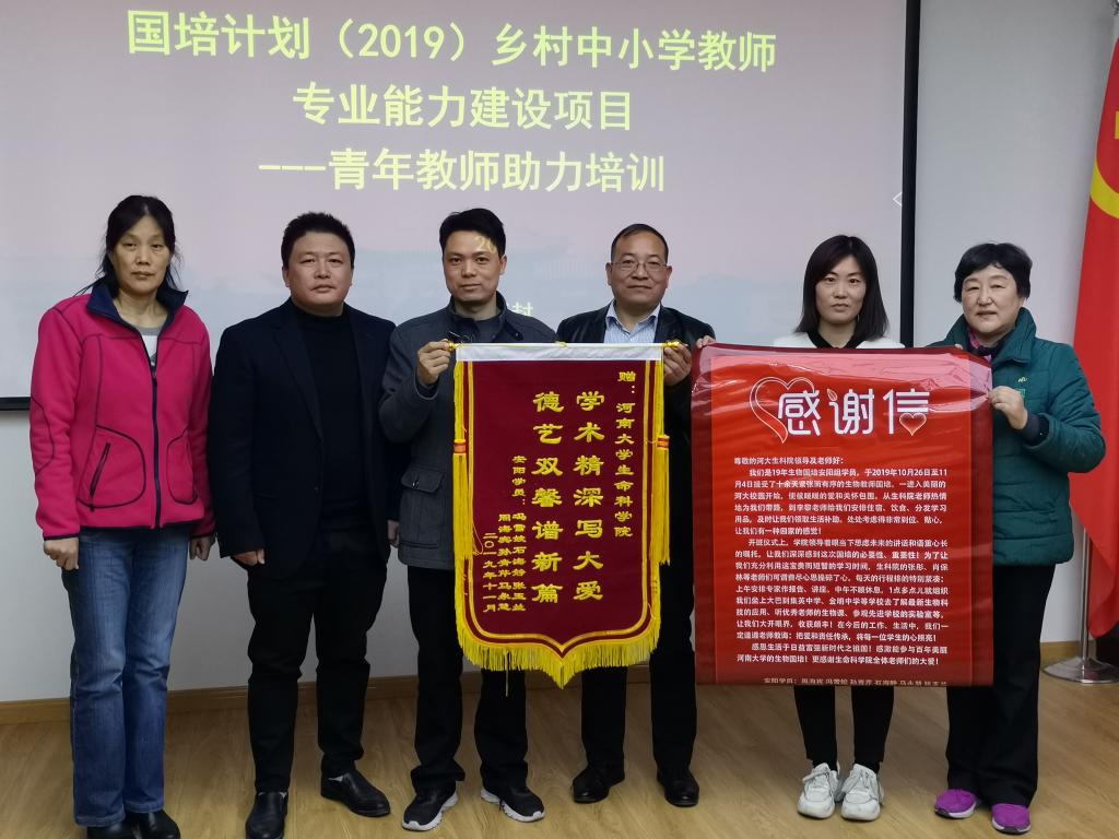 11月11日上午,“国培计划(2019)乡村中小学教师专业能力建设项目”生物班安阳组学员周海宾、冯雪娇代表全组成员专程从安阳赶来给bat365在线平台官网登录送来锦旗与感谢信,对学院安排组织的本次国培工作表示感谢。