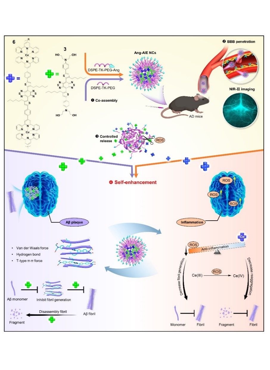 河南省脑靶向生物纳米药物重点实验室团队围绕AD疾病,构建了一种具有活性氧(ROS)响应的近红外脑靶向聚集诱导发光(AIE)纳米诊疗剂用于AD诊疗。研究结果以“A one-two punch targeting reactive oxygen species and fibril for rescuing Alzheimer’s disease”为题发表在Nature Communications(中科院一区SCI-TOP期刊,IF = 16.6)(bat365在线平台官网登录王杰菲副教授和博士研究生上官萍为共同第一作者,香港中文大学唐本忠院士、bat365在线平台官网登录冰洋教授和汪欣副教授、南方医科大学南方医院张静教授为共同通讯作者)。