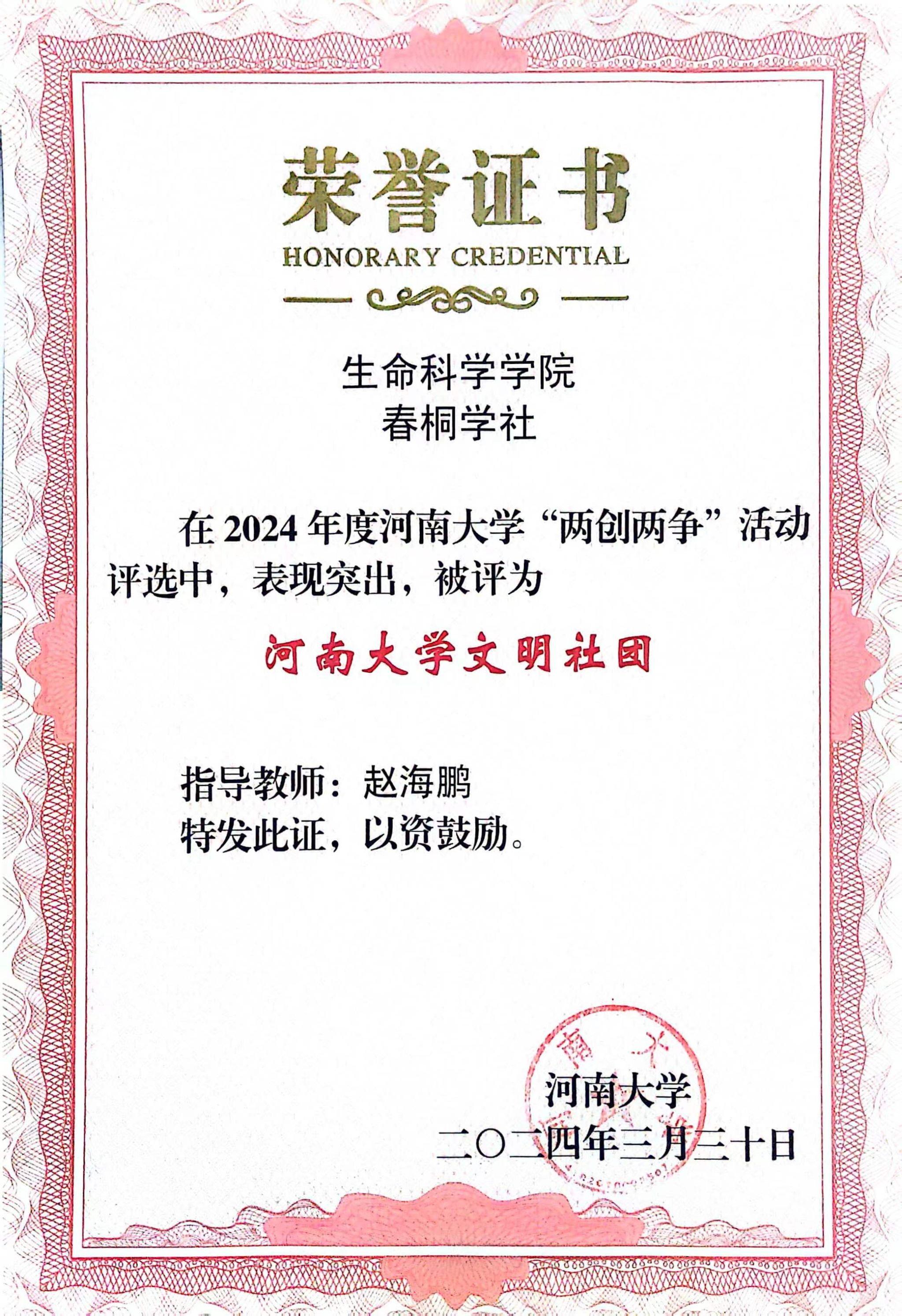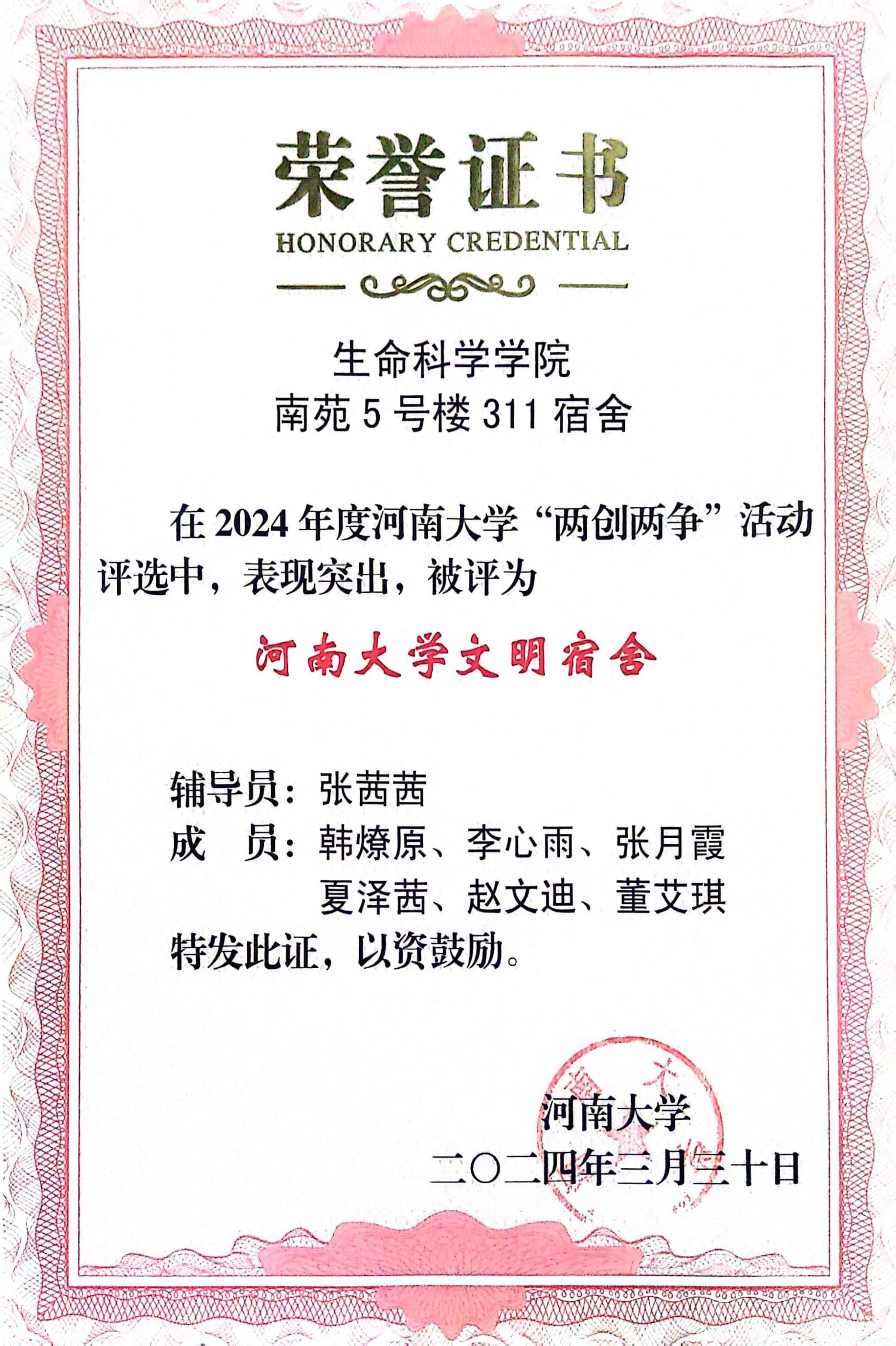 省部共建作物逆境适应与改良国家重点实验室2021 级硕士研究生班获“bat365在线平台官网登录文明班级”荣誉称号,春桐学社荣获“bat365在线平台官网登录文明社团”荣誉称号,2021级生物工程专业学生所在南苑5号楼311宿舍荣获“bat365在线平台官网登录文明宿舍”荣誉称号,2021级生物科学专业1班的李骋宇荣获“bat365在线平台官网登录文明学生”荣誉称号。