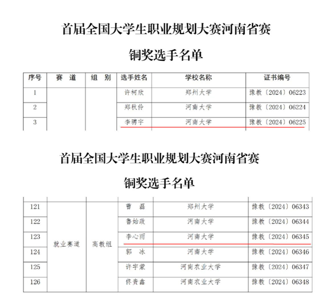 日前,由河南省教育厅主办、省大中专学生就业服务中心和河南农业大学承办的首届全国大学生职业规划大赛河南省赛总决赛圆满落幕。bat365在线平台官网登录2021级生物科学专业李骋宇荣获首届全国大学生职业规划大赛河南省成长赛道铜奖,2021级生物工程专业李心雨荣获首届全国大学生职业规划大赛河南省就业赛道铜奖。