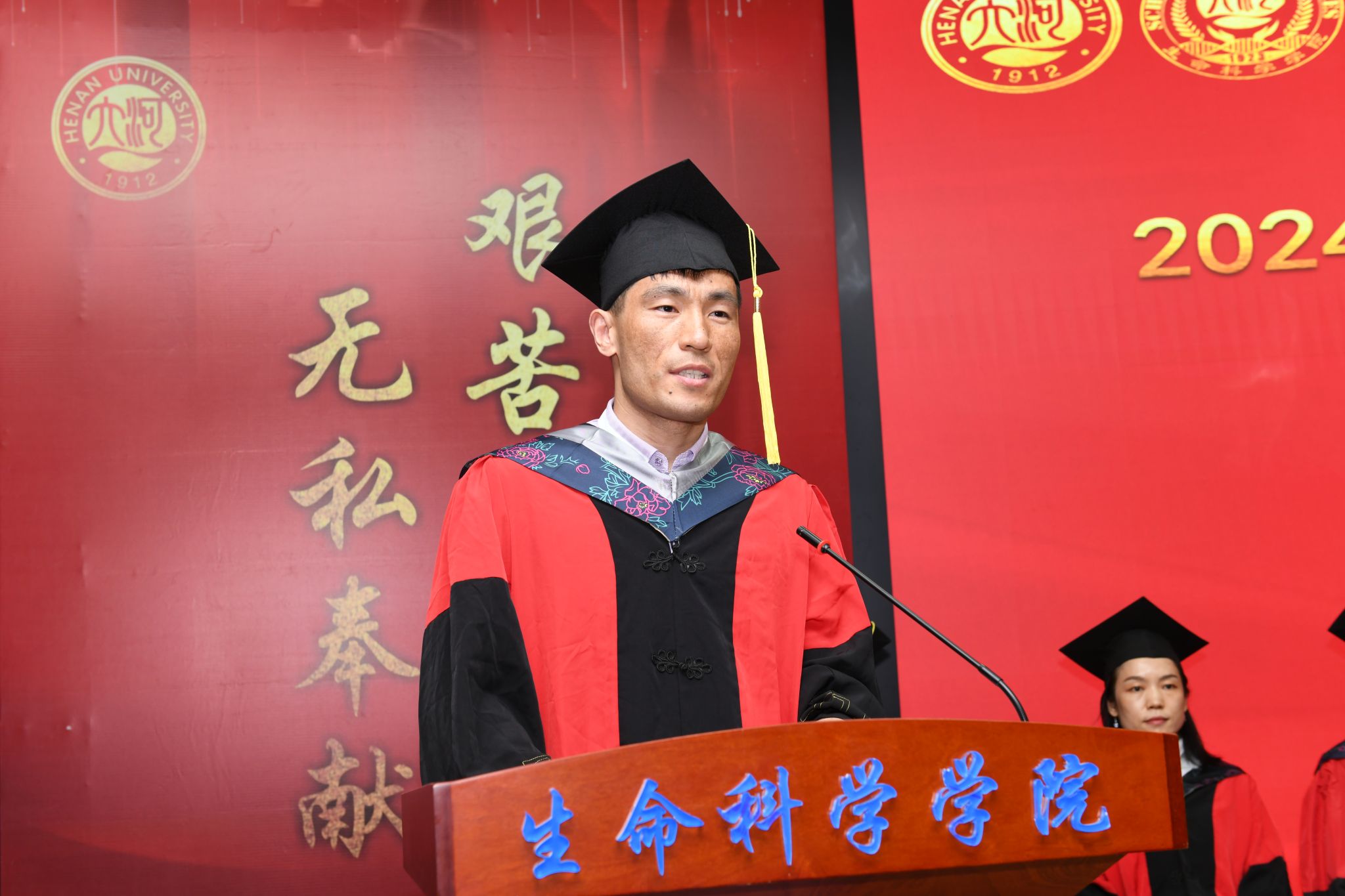 毕业生代表、国重实验室2020级博士研究生贾明珠代表全体2024届毕业研究生发言,向学校、学院以及老师表达了感激之情。她回顾了在河大求学的十年时光,每一份付出承载着汗水、希望,更记录着学校和自己“超越、突破、引领”的蜕变。在校生代表、bat365在线平台官网登录2022级硕士研究生赵晨晨回忆了与师兄师姐们在校园中的点滴过往,并代表在校生向毕业生表达了感谢和祝福,希望师兄师姐把小我融入大我,在新的征程中创造不平凡的事业。