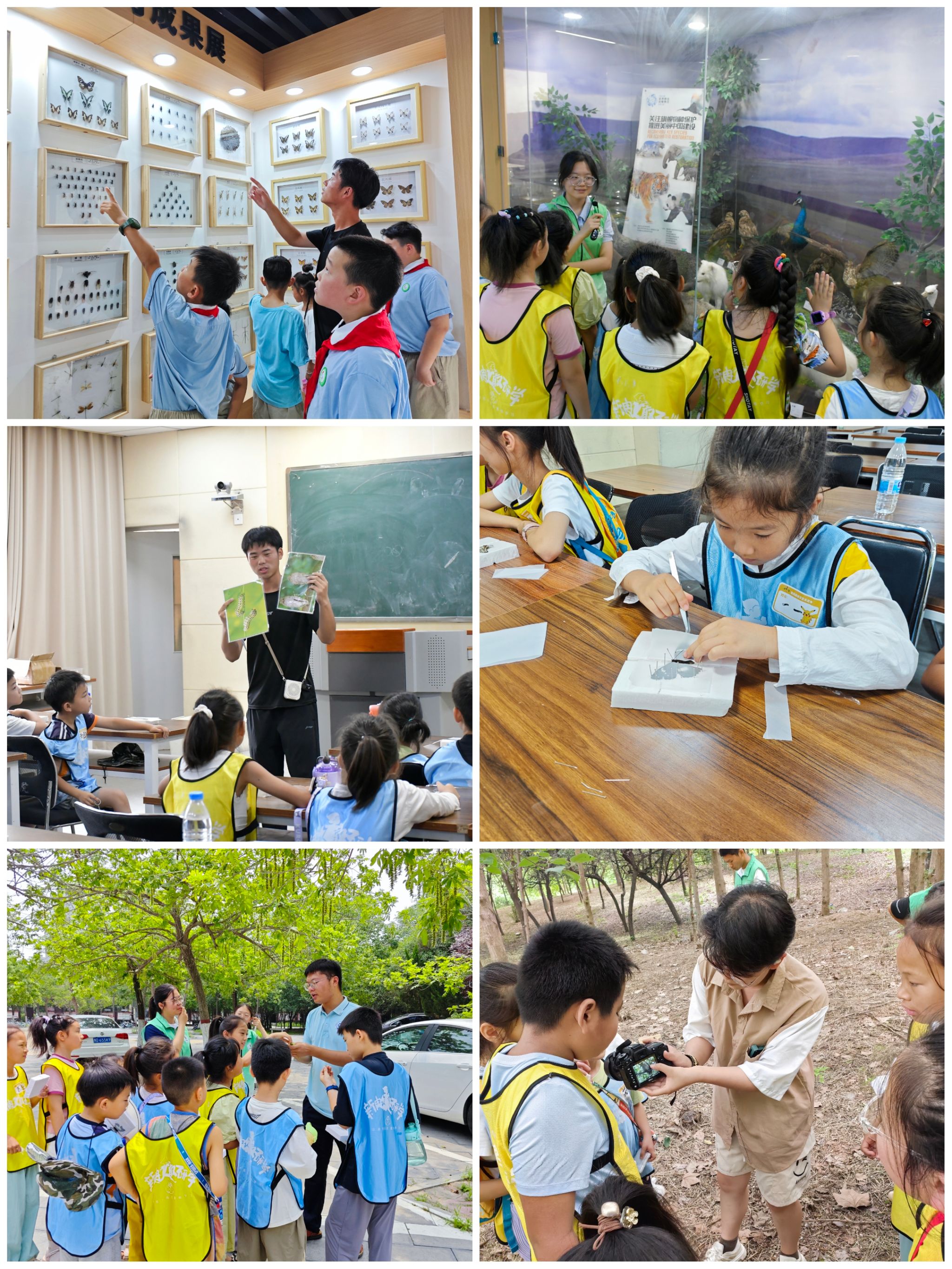 昆虫标本制作,蝴蝶仙子重生。志愿者们围绕蝴蝶进行了专业讲解,如蝴蝶的种类、分布、成虫过程等。讲座结束后进入标本制作环节,志愿者们耐心指导小朋友们将蝴蝶放置于自制的昆虫展翅板上,用昆虫针将蝴蝶身体垂直固定于展翅板沟槽中,再用镊子将两翅展开并整理好,最后用玻璃纸压住两翅配合大头针固定蝴蝶位置,一幅幅精美的蝴蝶标本就完成了。