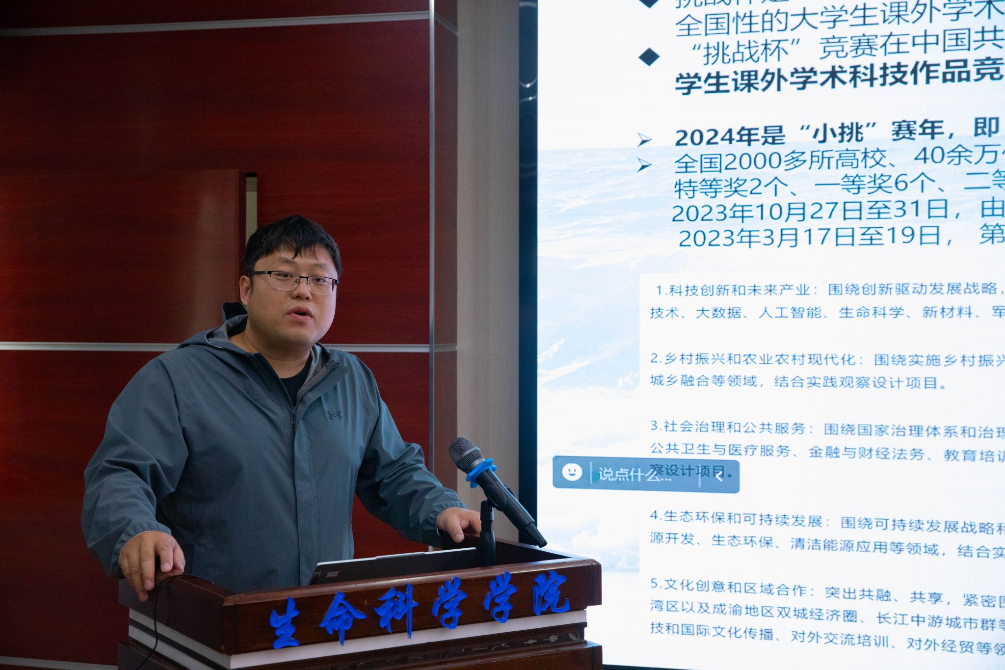孙杨作为全国创新创业类竞赛评委,曾指导学生多次获得国家级荣誉。他围绕“挑战杯”赛事认知、赛事培训、赛事结果以及备赛建议等内容深度解析,与同学们充分交流。他介绍了本届“挑战杯”赛道设置、赛事流程以及时间节点,讲解如何根据参赛作品类型选择合适的赛道,并将学习中奇思妙想转化为具有创新性的高质量竞赛项目。他结合国赛获奖项目实例,剖析优秀作品的优势和特色,叮嘱同学们从中汲取经验,对参赛项目进行优化,提升原创性和应用性。他鼓励同学们要牢记“以终为始”、“团队为先”、“好项目的生命周期”、“求真务实”等参赛原则,充分利用学科优势和科研平台将所学知识与实践相结合,整合资源、挖掘潜力、发挥优势,最终取得优异成绩。
