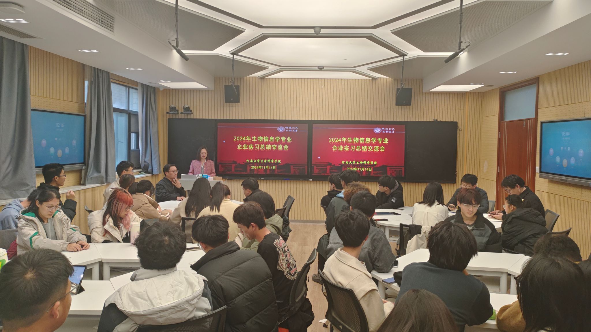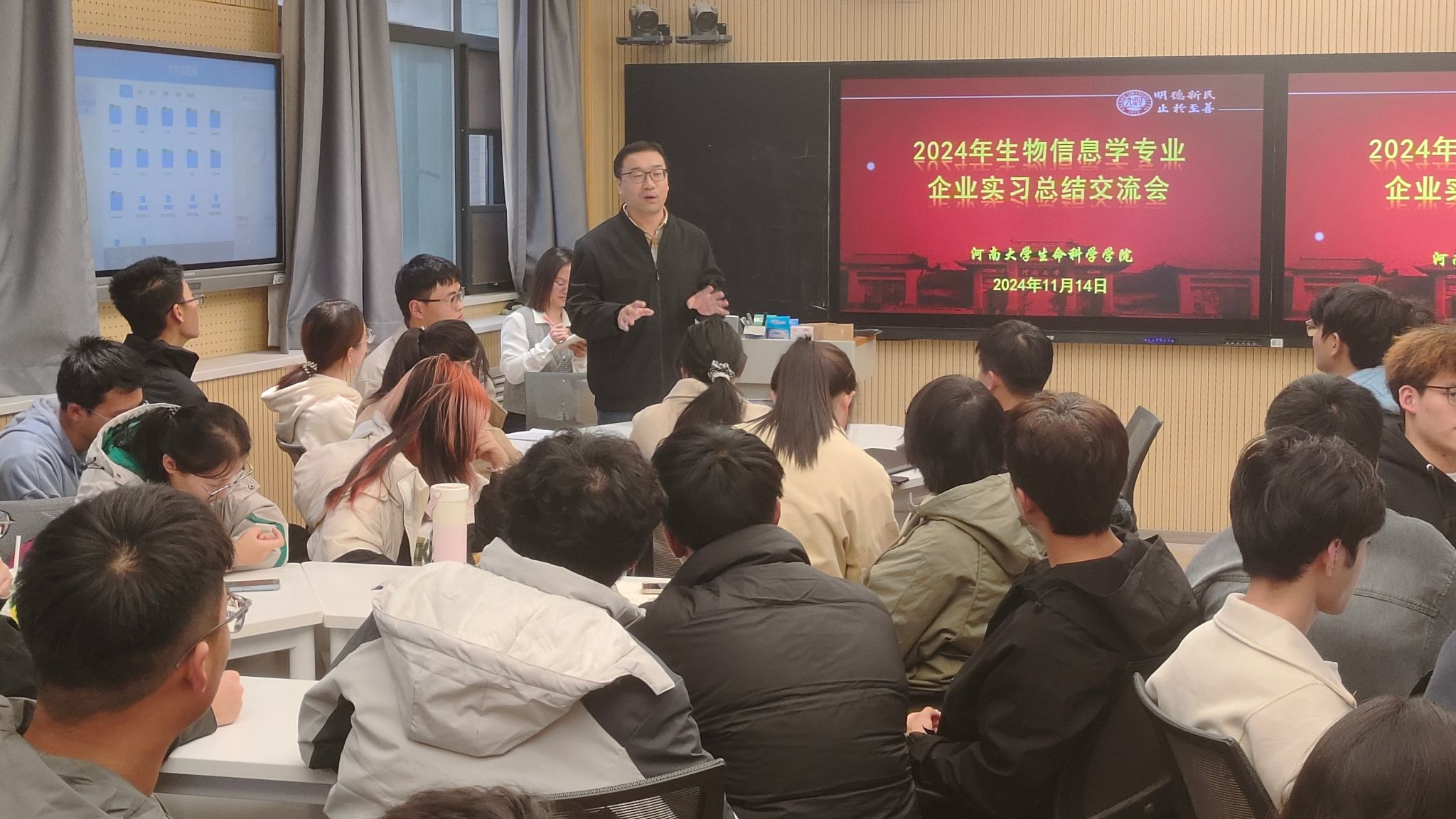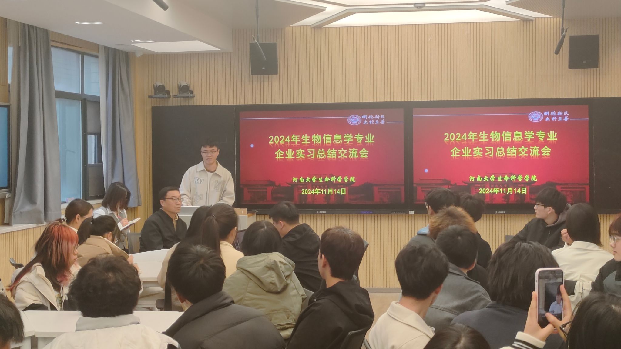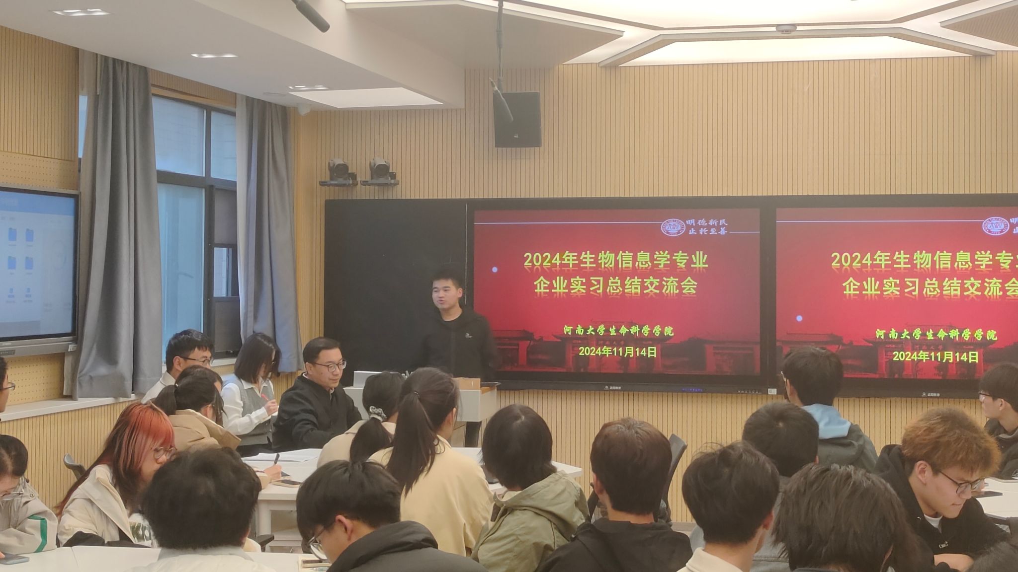 在自由交流环节,同学们主动分享实习感受,纷纷表示通过此次实习,系统了解高通量测序行业现状与发展趋势,熟悉各类组学数据分析流程的底层运算逻辑,结合计算生物学知识背景,动手解决项目分析中遇到的实际难题,充分认识生物信息学领域的职业设置和岗位晋升途径,为做好职业规划提供参考。2022级本科生付鑫磊在分享中提到,感谢学院的精心安排,实习不仅为同学们提供了检验课堂学习成效的宝贵机会,也帮助同学们快速熟悉专业岗位工作节奏,通过与企业一线专业技术人员的交流,拓宽了专业视野,提升了专业技术,掌握了获取行业新动态的渠道。