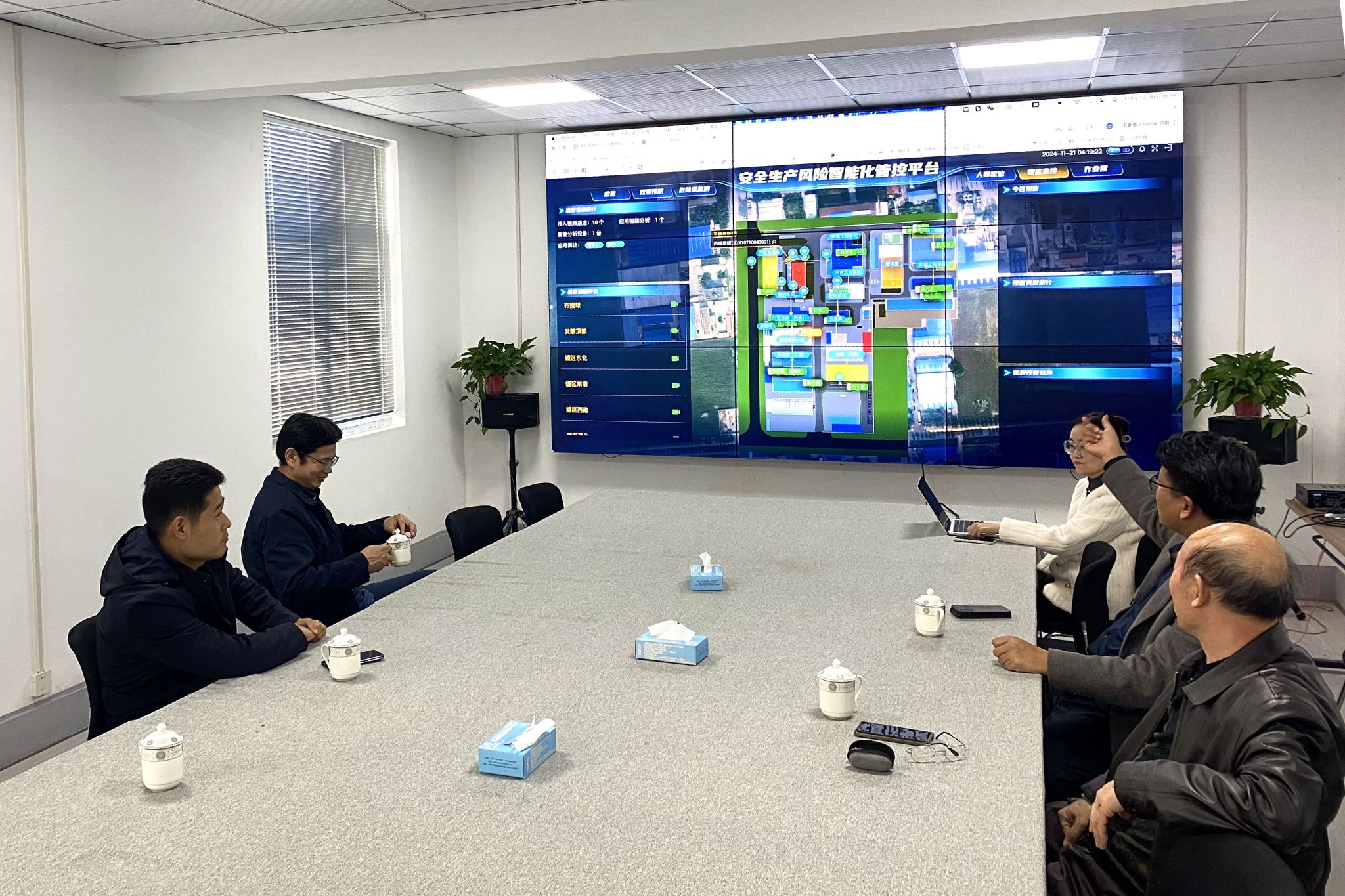 朱文涛对母校老师到访表示欢迎,详细介绍了公司的发展历程、公司现状以及人才团队建设等情况,重点介绍了公司的发展理念、定位及前景,并详细讲解了公司的“安全风险智能化管控平台”。朱文涛表示作为校友企业,将进一步加强与学校的合作,推进产学研校企成果转化,为学院的发展为推动母校高质量人才创业就业等方面作出更大贡献。