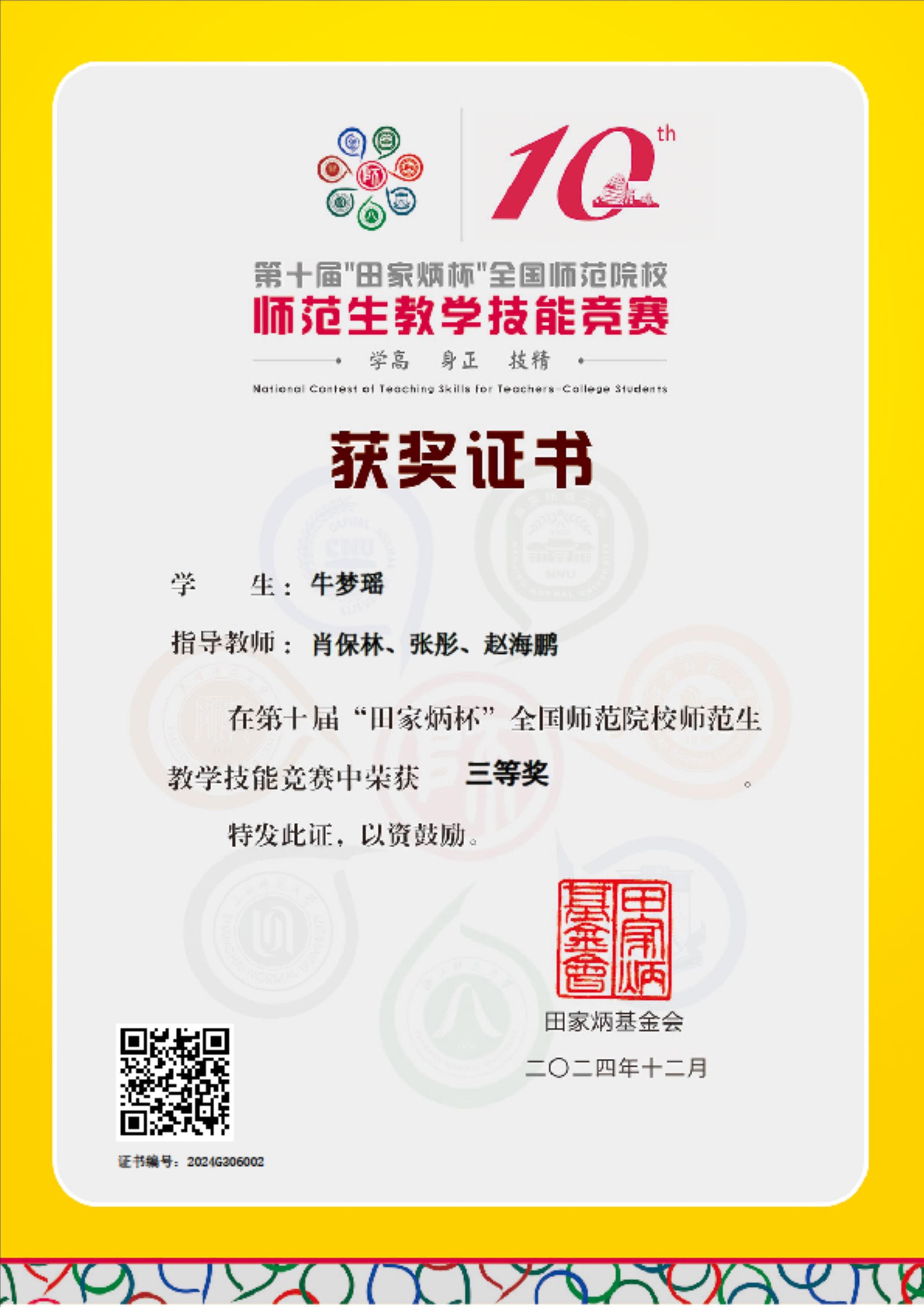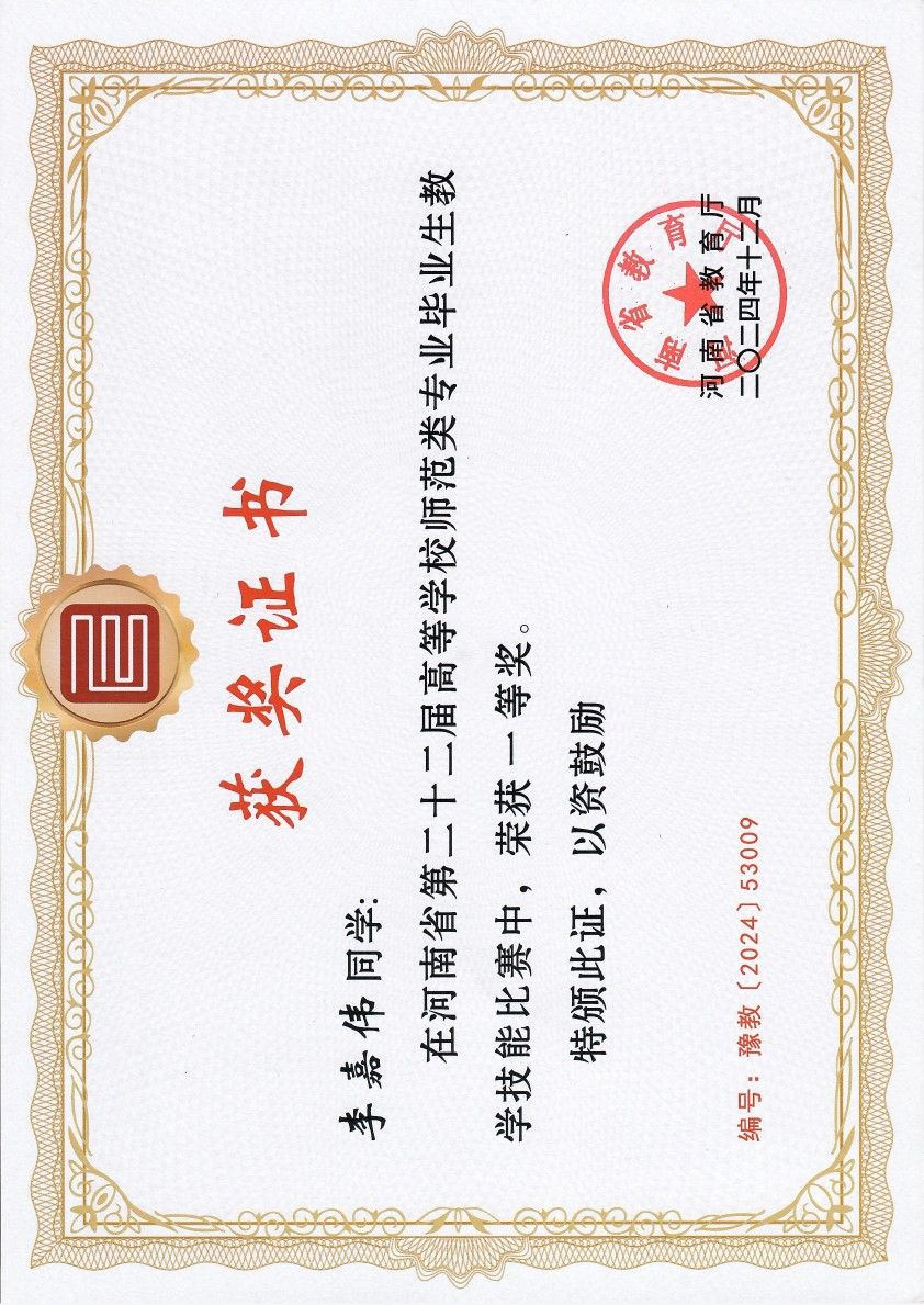 在河南省第二十二届高等学校师范类专业毕业生教学技能比赛中,李嘉伟同学因其优异的现场表现荣获一等奖,牛梦瑶同学荣获二等奖,王欣瑶和刘炉蔓同学荣获三等奖。此外,在第十届“田家炳杯”全国师范院校师范生教学技能竞赛中,牛梦瑶同学荣获三等奖。